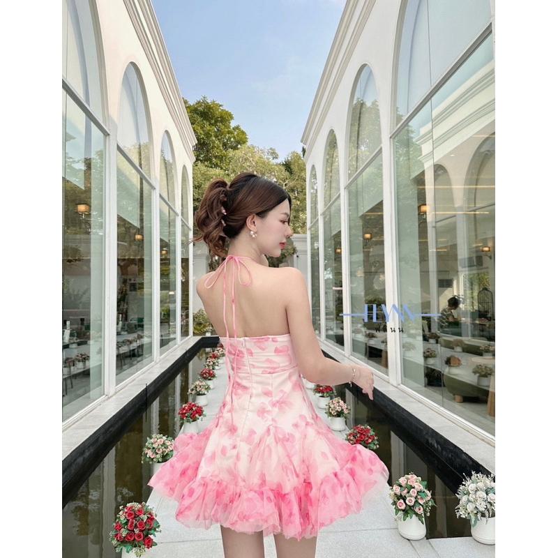 เดรสคล้องคอพิมพ์ลายชมพูขาวหวานเวอร์ ดีเทลอลังการ ตัวอกแต่งจับจีบมีเข็มกลัดดอกไม้ผ้าตัว
