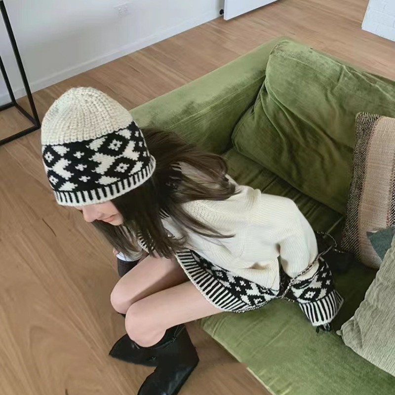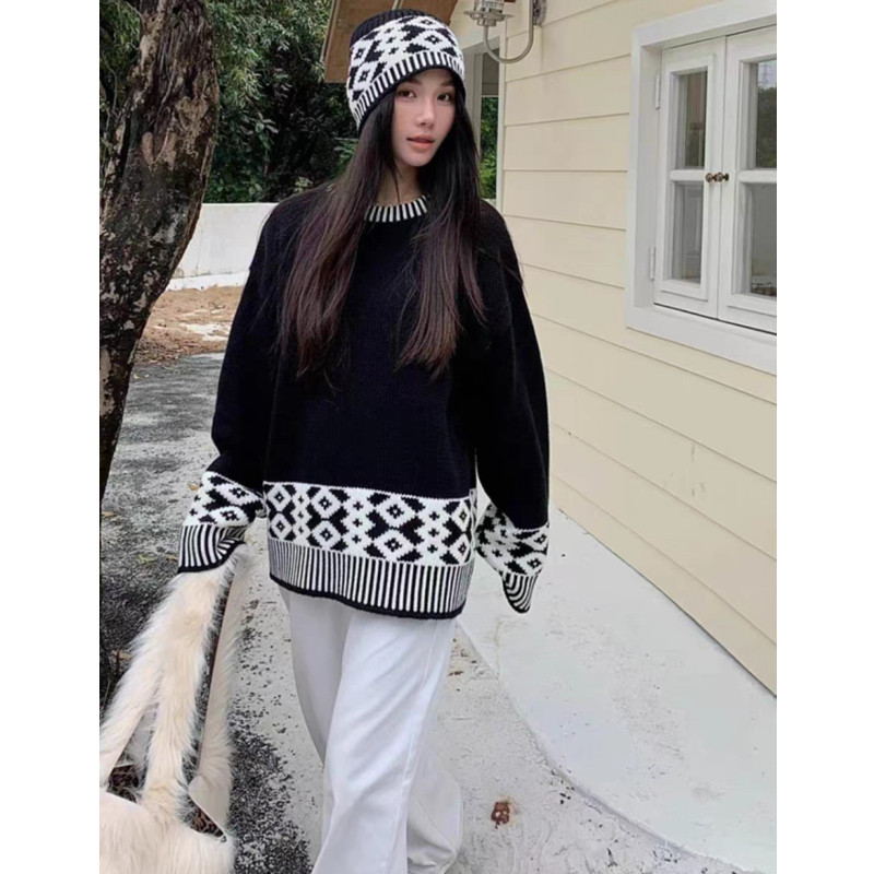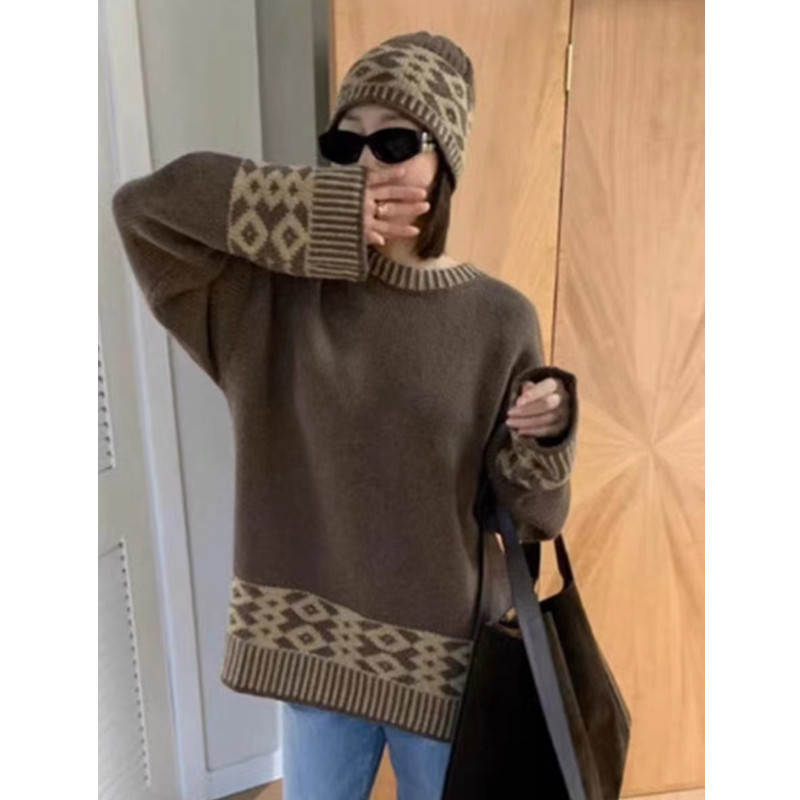 ฤดูใบไม้ร่วงใหม่ผู้หญิงเกาหลีรุ่นสีตัดกัน ผ้าแจ็คการ์ด หลวมสบายๆรอบคอเสื้อแขนยาวอเนกประสงค์เสื้อกันหนาว + หมวก 241016