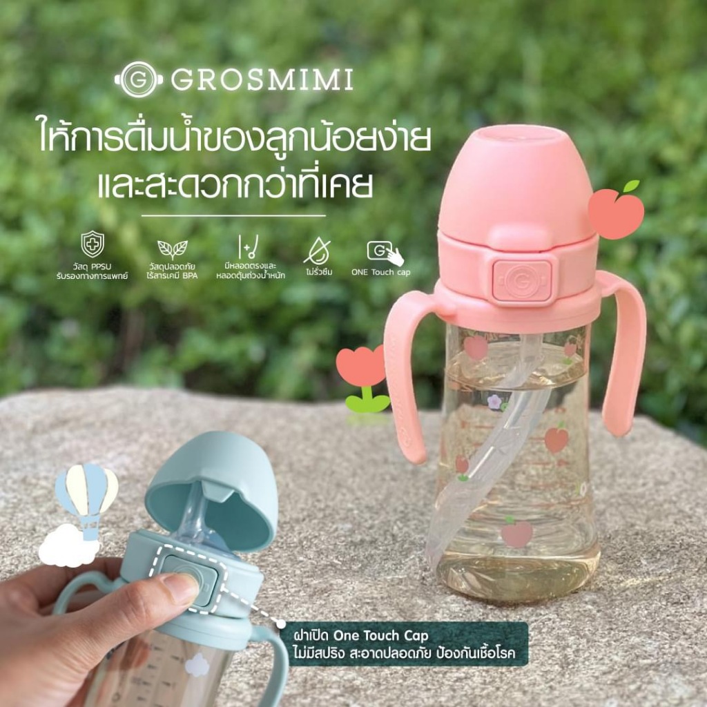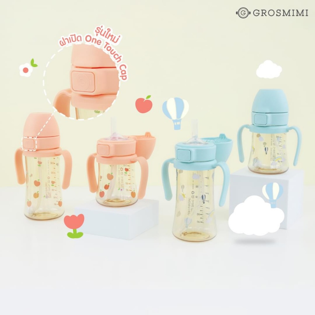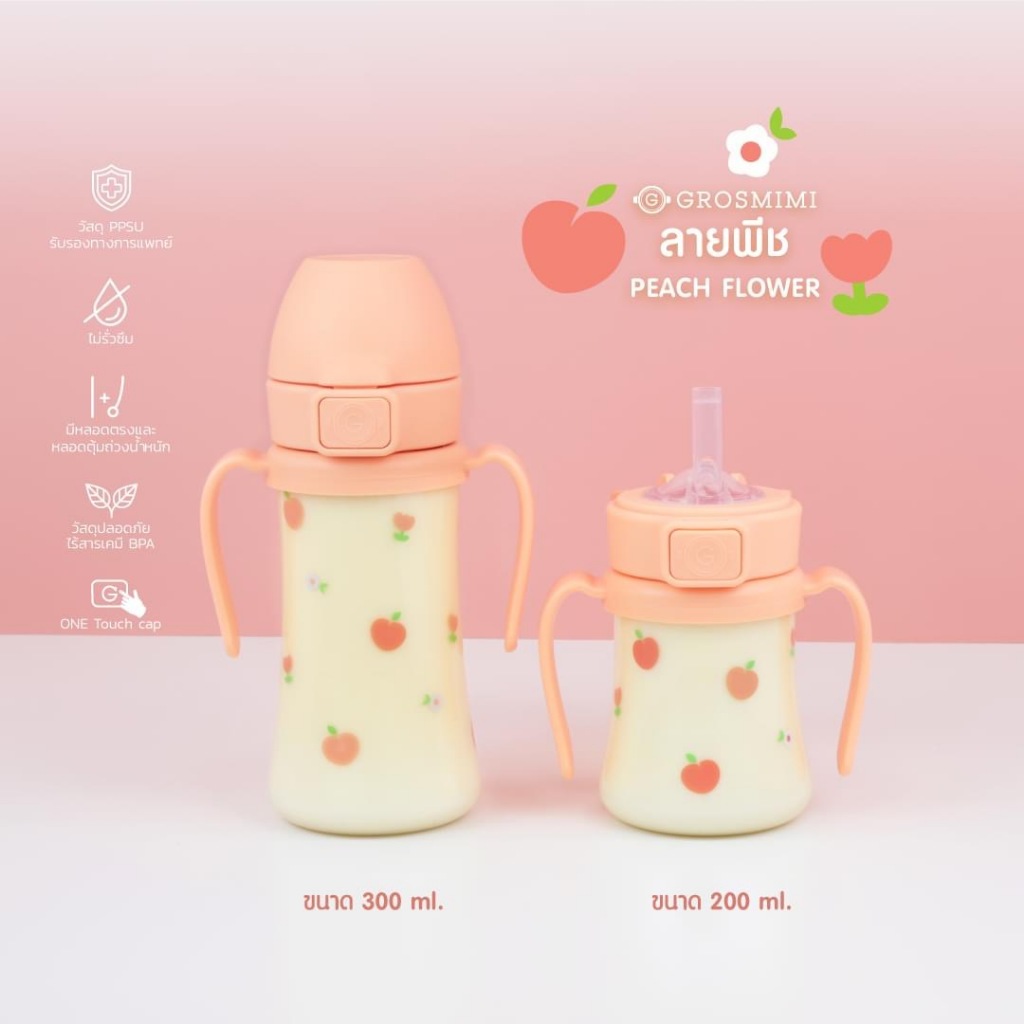 ขวดหัดดูด Grosmimi PPSU Straw Cup (Peach Flower) 300มล.ฝาปิด One Touch Cap และที่จับหมุนได้ 360 องศา