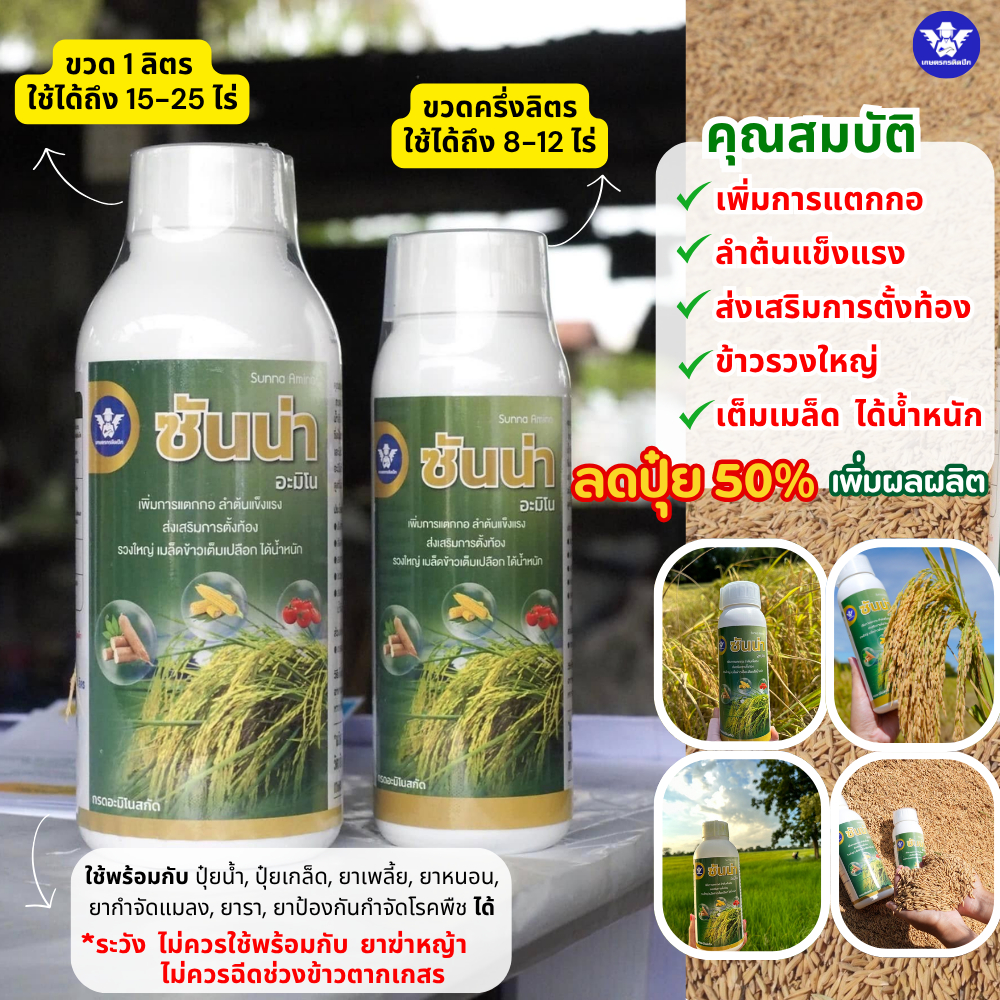 ซันน่า อะมิโน หัวเชื้อเข้มข้น-สูตรลดปุ๋ย | เพิ่มการแตกกอ บำรุงข้าวตั้งท้อง รวงใหญ่ ได้น้ำหนัก