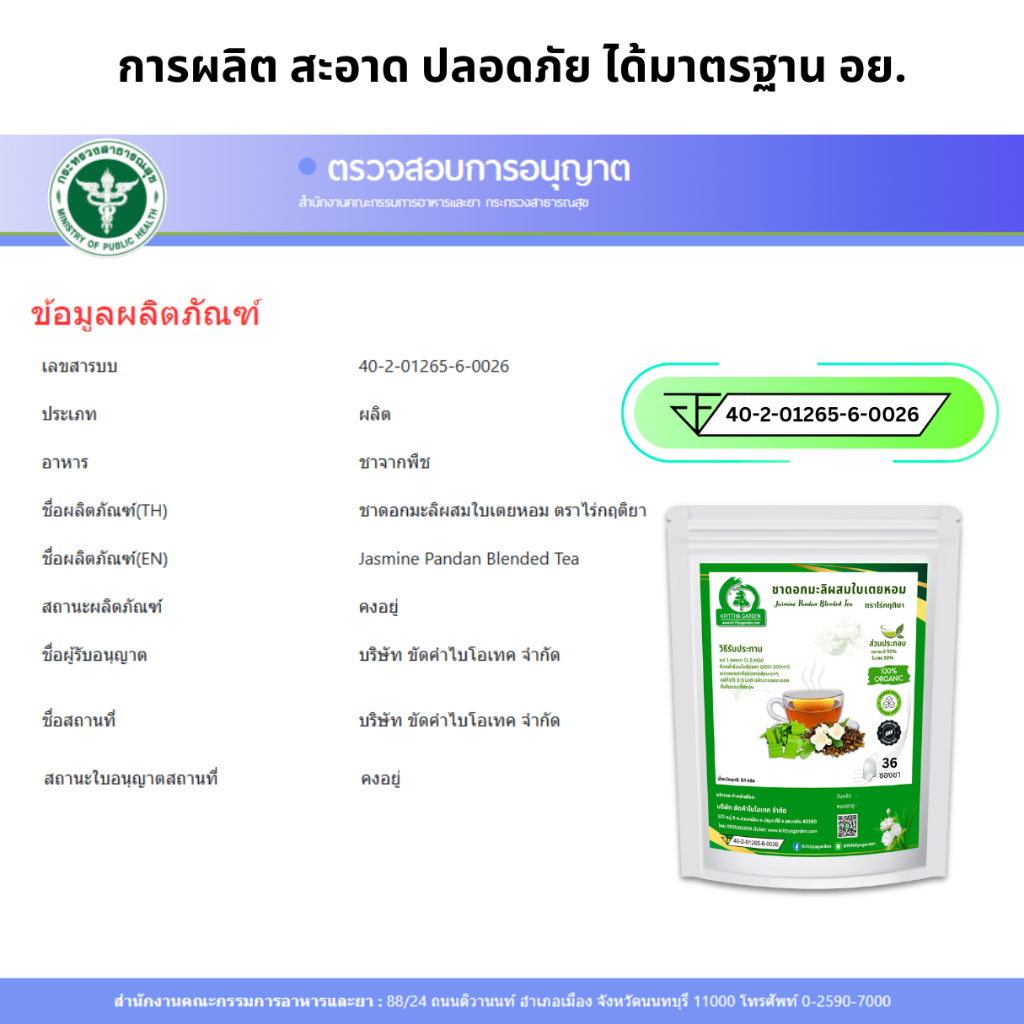 ขาดอกมะลิผสมใบเตยหอม ตราไร่กฤติยา (Jasmine Pandan Blended Tea)