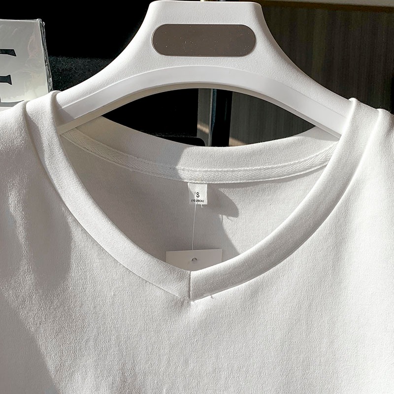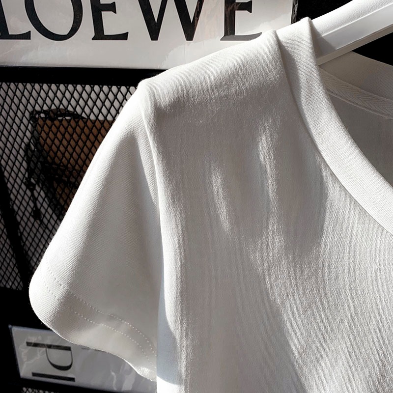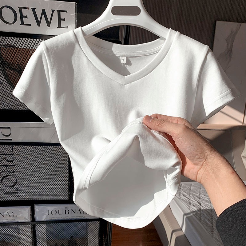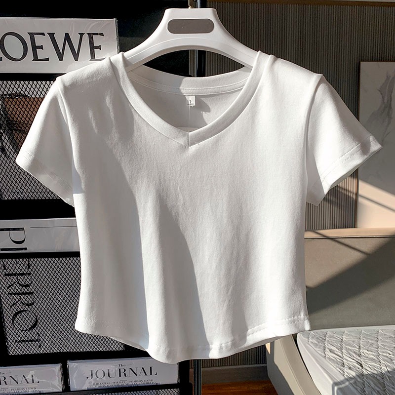 Y6Y - เสื้อยืดแขนสั้นคอวีสีขาวแฟชั่นผู้หญิง เสื้อครอปสีพื้นสไตล์เกาหลี