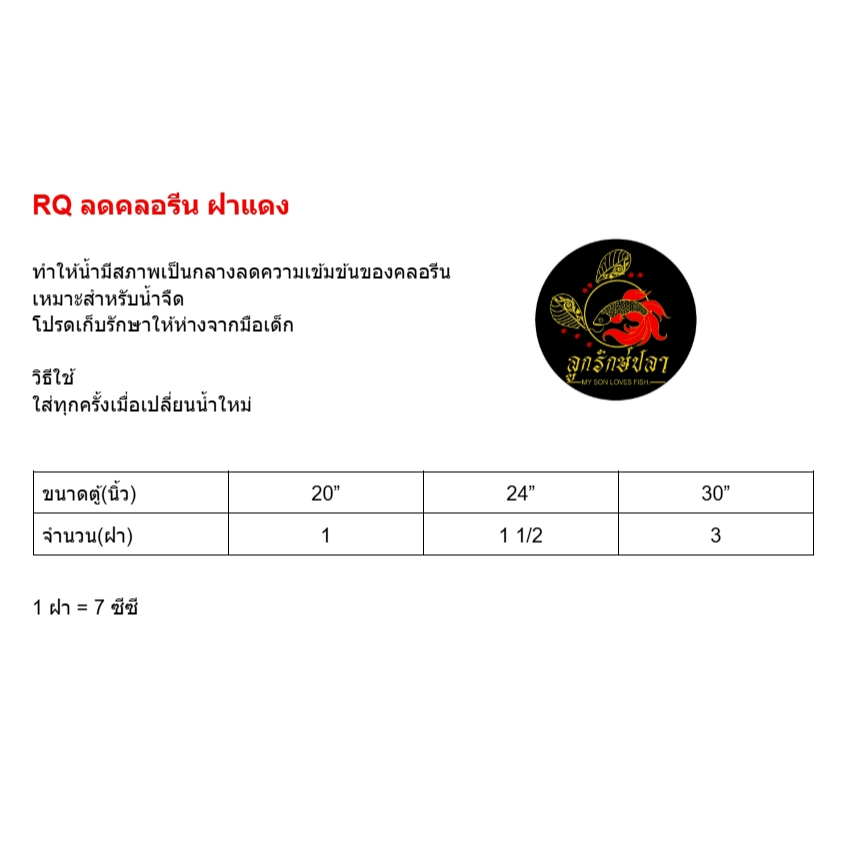 RQ ลดคลอรีน ฝาแดง ลดคลอรีนในตู้ปลา ใช้ลดคลอรีนในน้ำปะปา ลดคลอรีนได้ผล100%