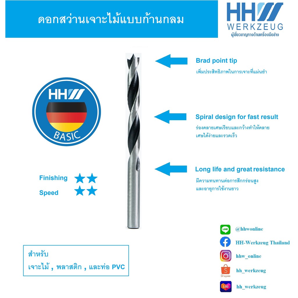 HHW ดอกสว่านเจาะไม้ ขนาด 3-12 มม., Twist drill bit for wood ขนาด 3-12 mm.