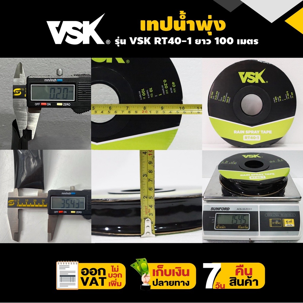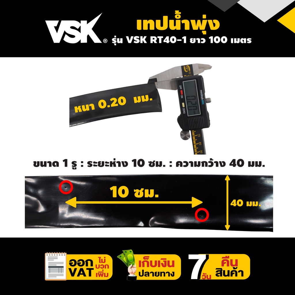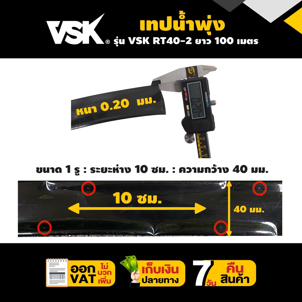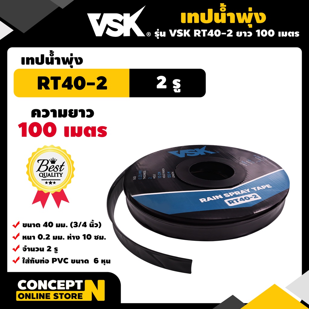 เทปน้ำพุ่ง VSK ขนาด 40 มม.(3/4 นิ้ว) หนา 0.2 มม. ระยะห่าง 10 ซม. จำนวนรูให้เลือก 1รู, 2รู, 3รู ยาว 100 เมตร Concept N