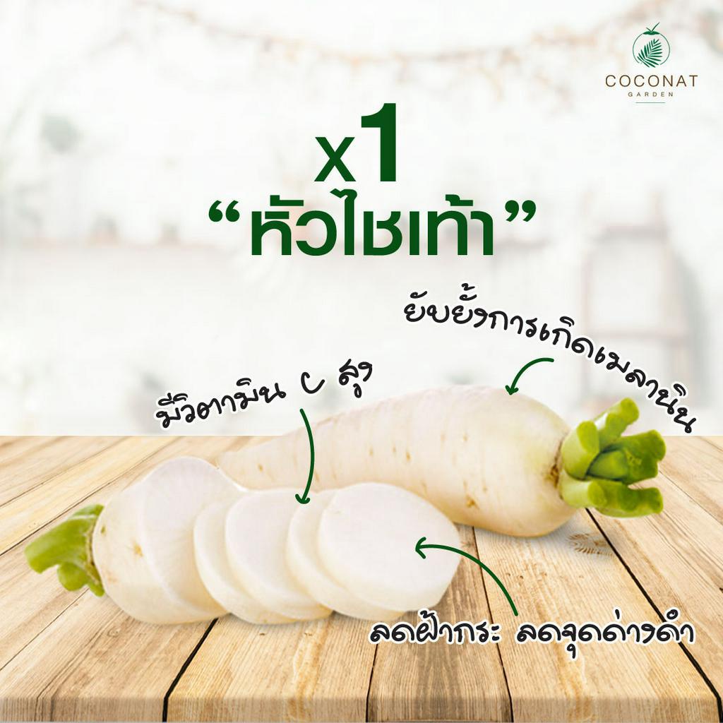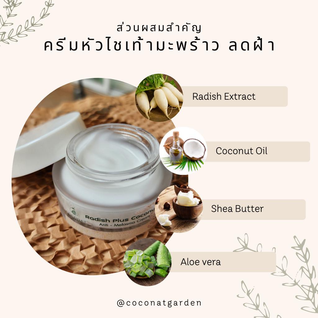 ครีมทาฝ้าจากสารสกัดหัวไชเท้ามีผลการวิจัยว่า ช่วยลดฝ้า กระ รอยสิวได้ดี ร่วมกับน้ำมันมะพร้าววิตามิน E