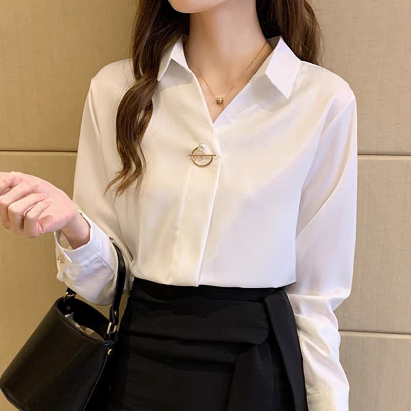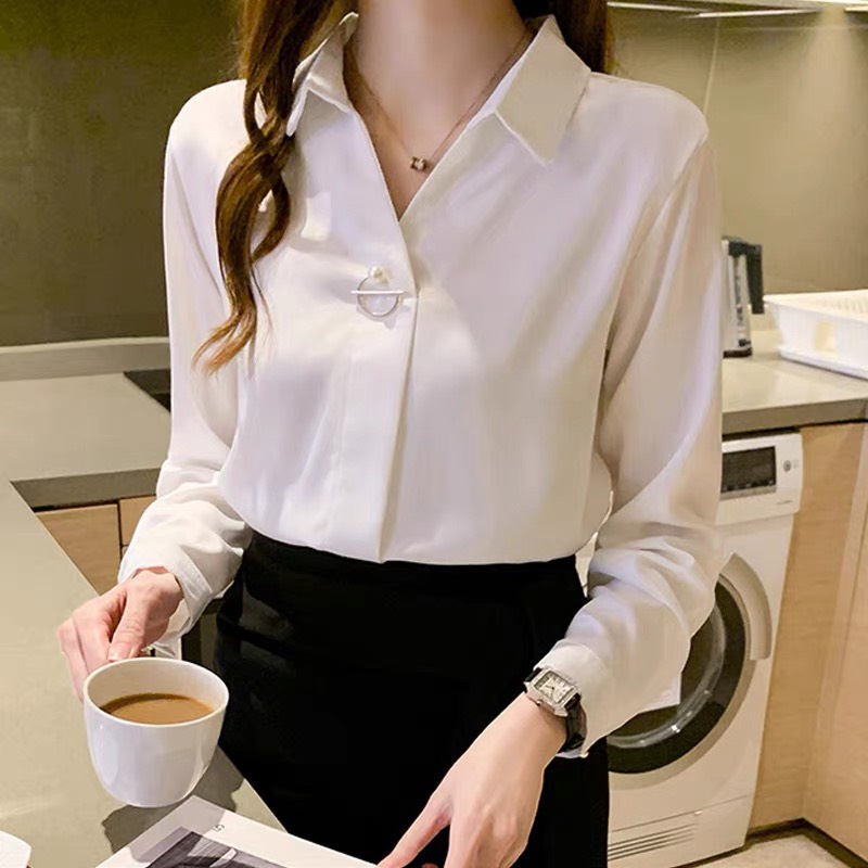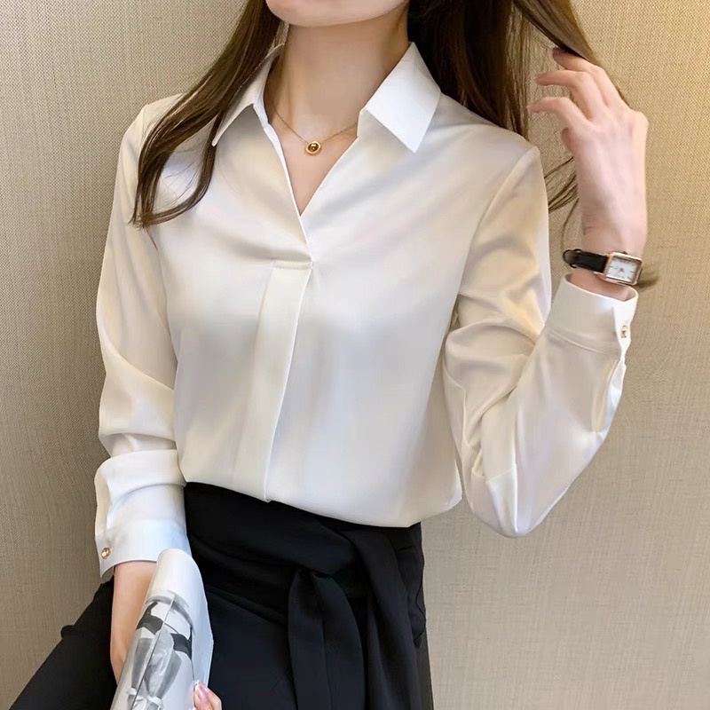 เสื้อเชิ้ตผู้หญิงแขนยาวเนื้อผ้าชีฟอง สไตล์คนทำงาน ออกแบบไม่มีกระดุมข้างหน้ามีดแถมเข็มขัดให้ด้วย New Fashion 2026