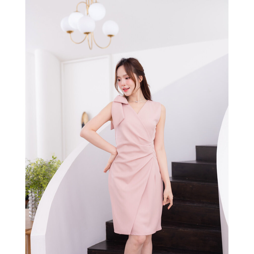 Dacia Bow Shoulder Dress – สีชมพู