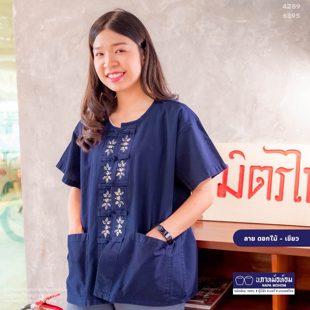นภาหม้อห้อม - เสื้อคอกลม แขนสั้น กระดุมจีน ปักลาย ดอกเขียว