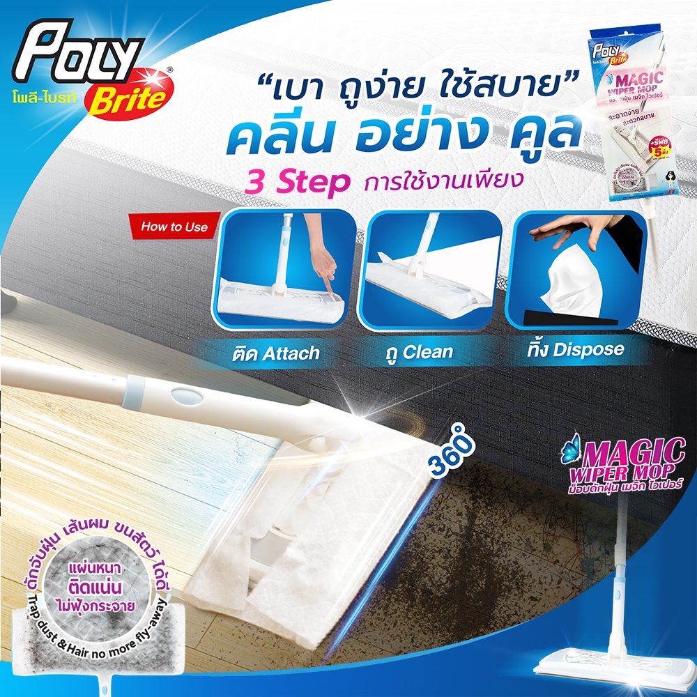 Poly-Brite โพลี-ไบรท์ ไม้ม็อบดันฝุ่น เมจิกไวเปอร์ ม็อบ Magic wiper mop (แถมฟรี! รีฟิลแบบแห้ง แพ็ก 5 ชิ้น และ 25 ชิ้น)