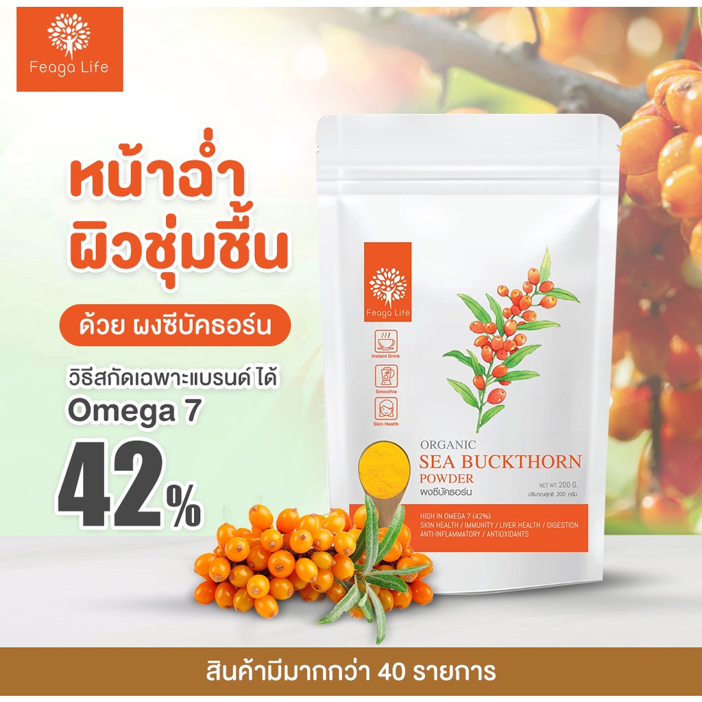 ผงซีบัคธอร์น ผิวชุ่มชื้น ช่วยย่อย Sea Buckthorn Powder ยี่ห้อ Feaga Life ฟีก้าไลฟ์ ปริมาณ 200 กรัม