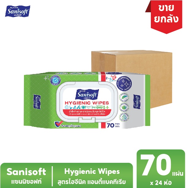 [ยกลัง 24ห่อ] Sanisoft Hygienic wipes 70’s / แซนนิซอฟท์ ผ้าเช็ดผิว สูตรไฮจีนิค 70 แผ่น/ห่อ