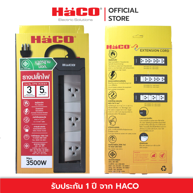 HACO ปลั๊กไฟ ปลั๊กพ่วง 3 ขา 3 ช่อง ยาว 5 เมตร มีสวิทช์แยกควบคุม EPN-3S3EB/5