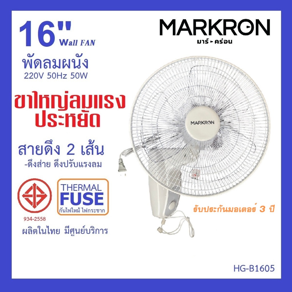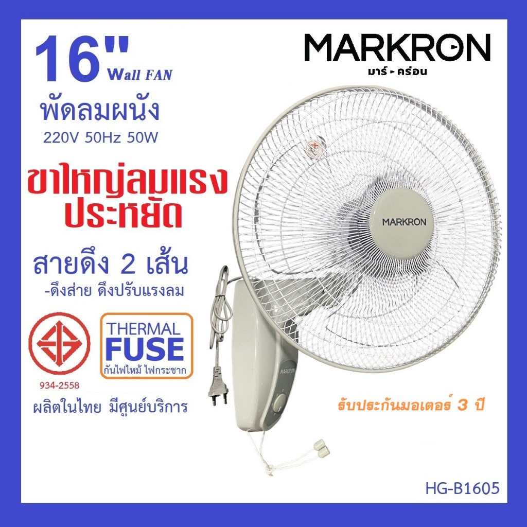 พัดลมผนัง 16 นิ้ว สายดึง 2 เส้น ปรับส่าย-ปรับความเร็ว รับประกัน 2 -3 ปี มีศูนย์บริการ มี มอก