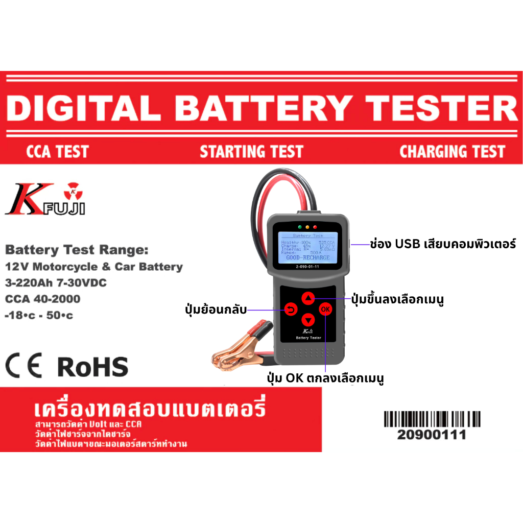 เครื่องวัดค่า CCA , Volt วัดแบตเตอร์รี่ 12V ไดชาร์ท ไดสตาร์ท K.FUJI 2-090-01-11