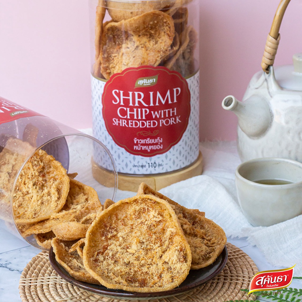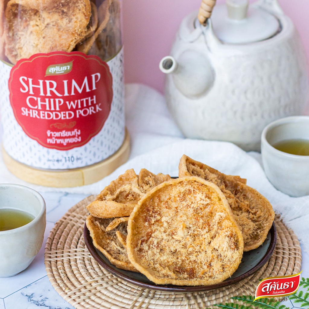 ขนมไทย สุคันธา ข้าวเกรียบกุ้งหน้าหมูหยอง 100 กรัม แบบกระป๋อง ขนมอร่อยจากเพชรบุรี SUKANTHA Shrimp Chip Shredded-Pork