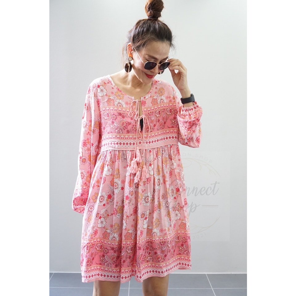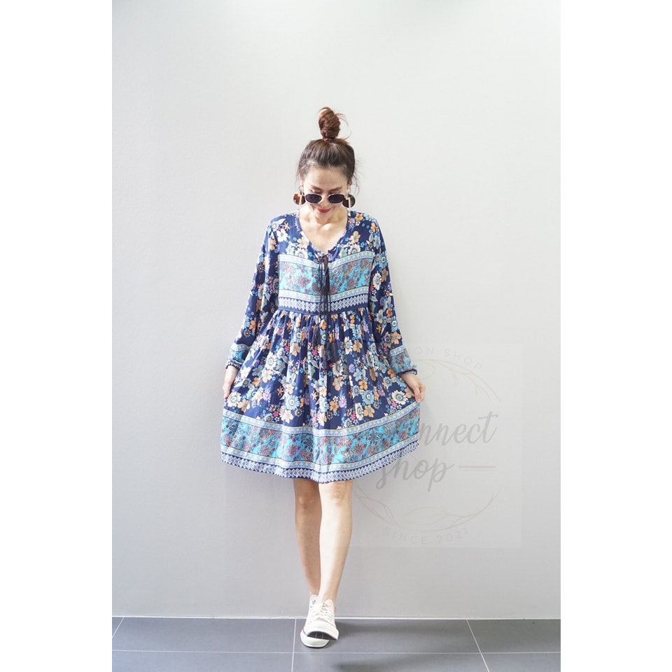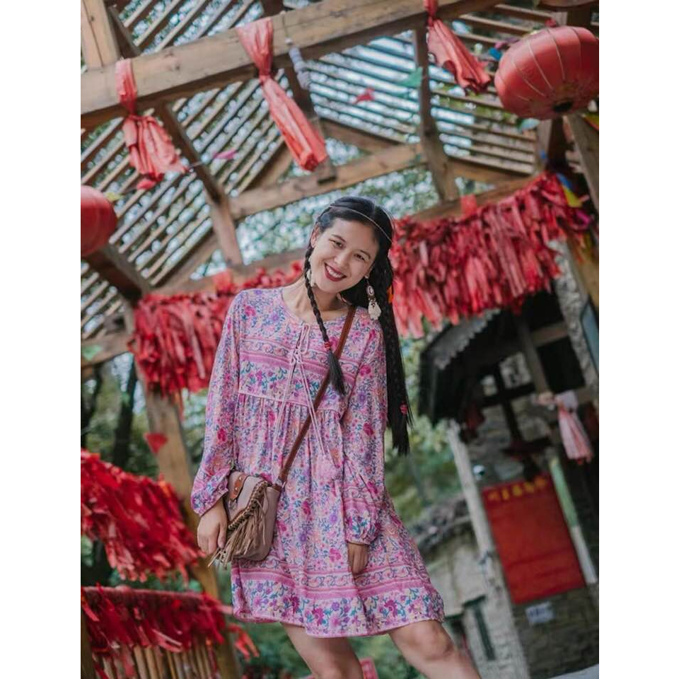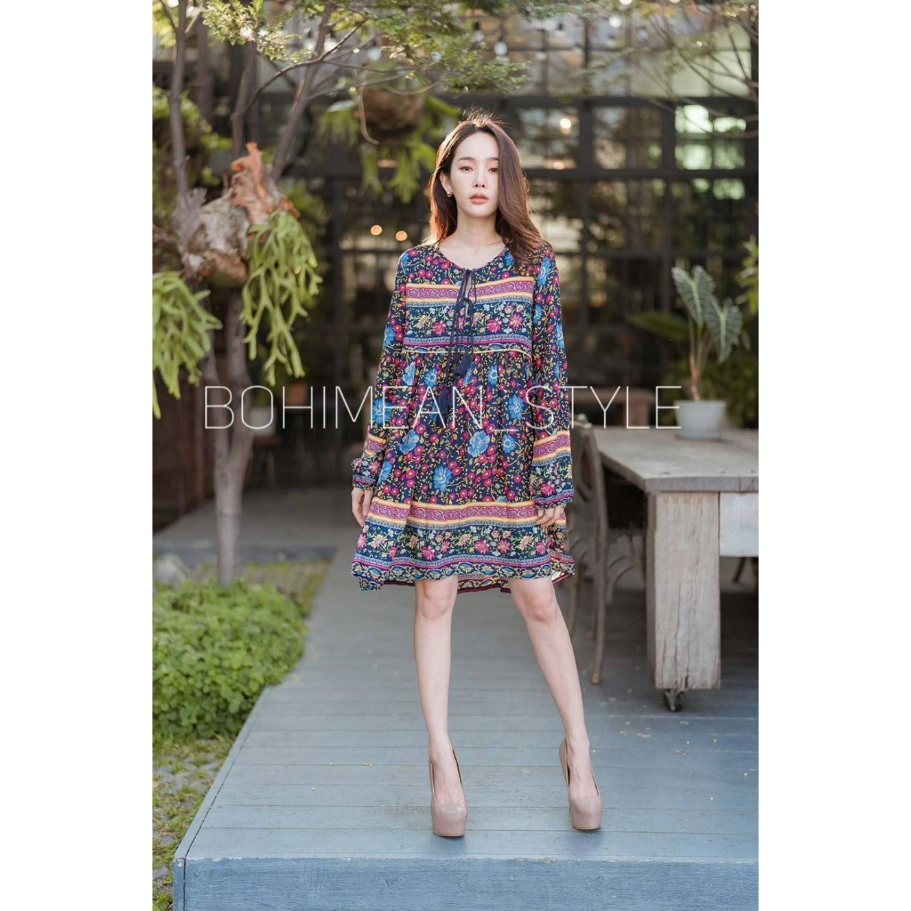 พร้อมส่ง ชุดเดรสสั้นผ้าพิมพ์ลายดอกไม้สีสันสดใส สไตล์โบฮีเมียนใส่ไปคาเฟ่น่ารัก