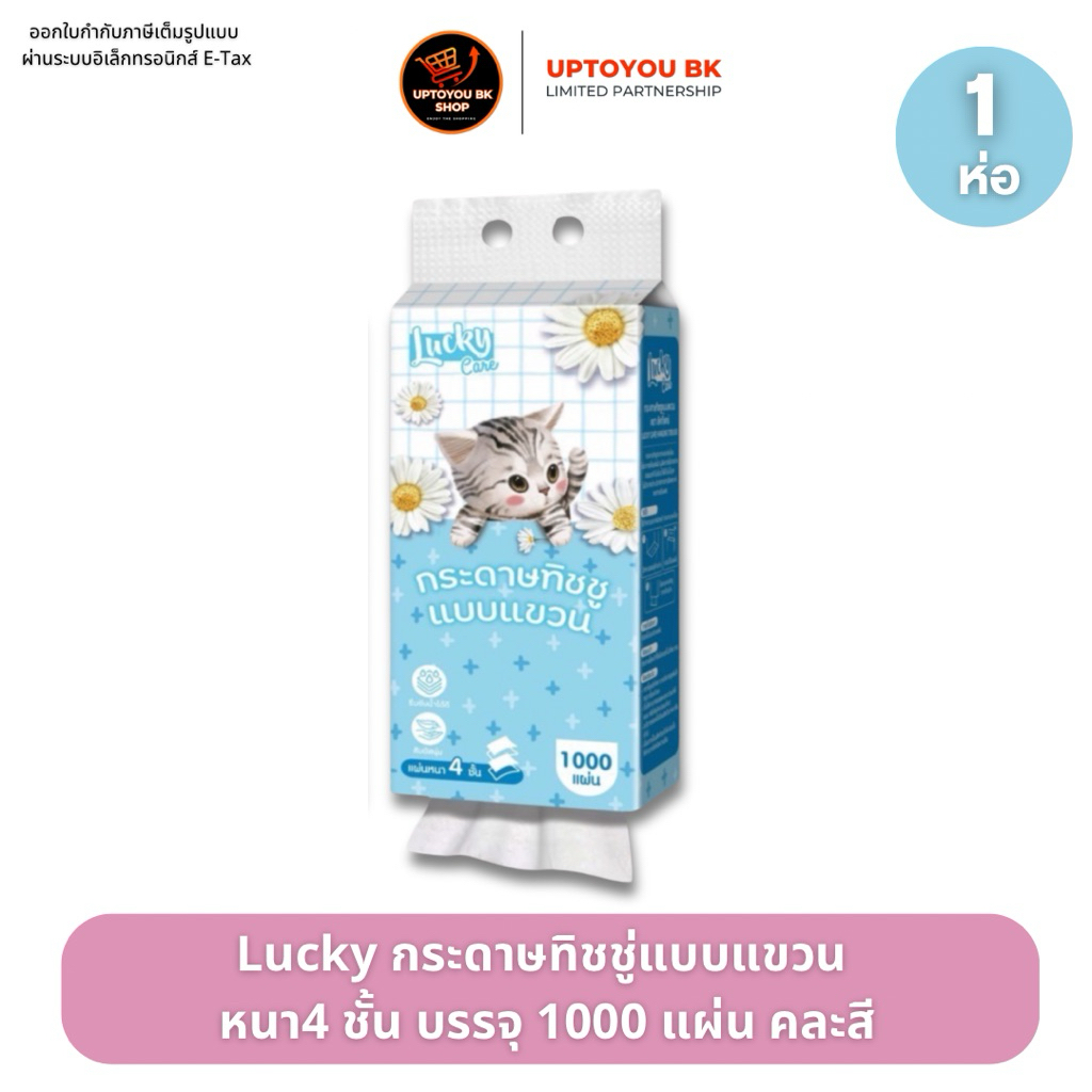 Lucky ลัคกี้ทิชชู่ ลายน้องแมว กระดาษทิชชู่ แบบแขวน 1 ห่อ : 1000 แผ่น หนา 4 ชั้น แขวนผนัง ซึมซับน้ำได้ดี สัมผัสนุ่ม