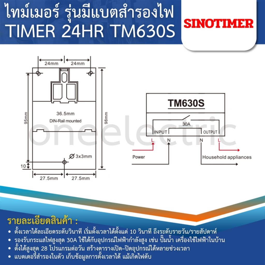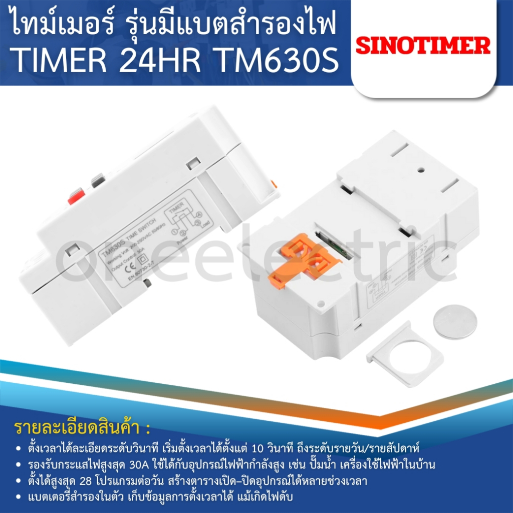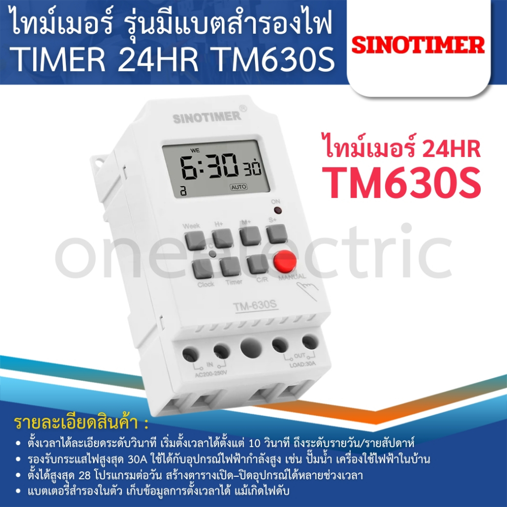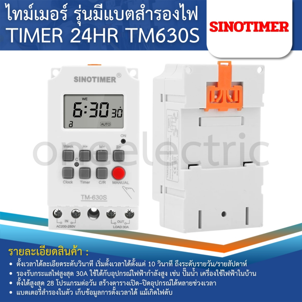 SINOTIMER TM630S ไทม์เมอร์ดิจิตอล 24HR รุ่นมีแบตสำรองไฟ 30A 220-230VAC TIMER 28 ON/OFF Programs