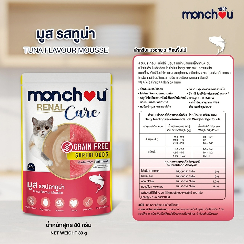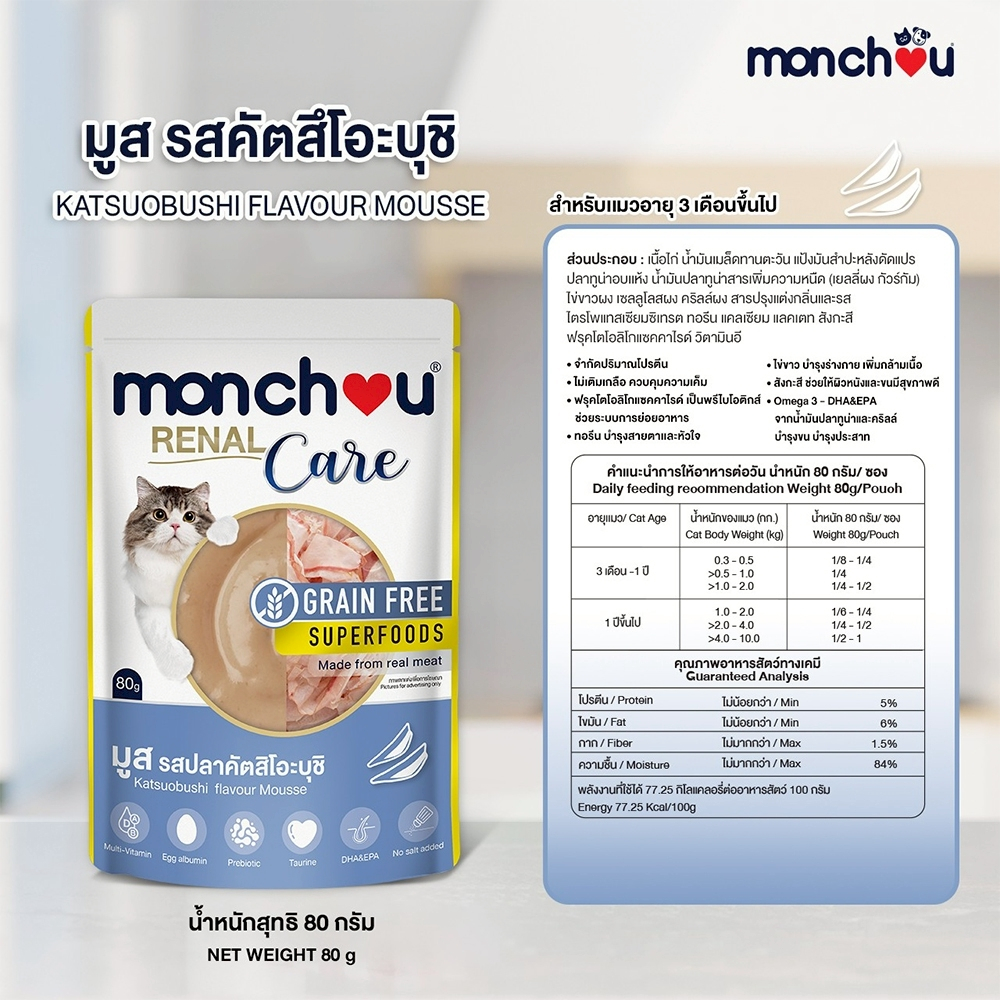 อาหารแมว Monchou มองชู อาหารเปียกแมว เนื้อมูส สูตรRenal Care-ดูแลไต แบบซอง 80g (6ซอง / 12ซอง)