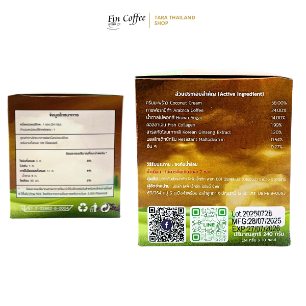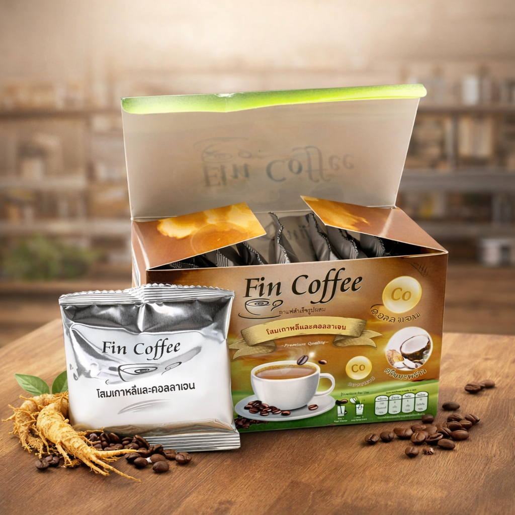 กาแฟสำเร็จรูป Fin Coffee สูตรโสมเกาหลีและคอลลาเจน – หอมละมุน ดื่มง่ายทุกวัน 24 กรัม x 10 ซอง
