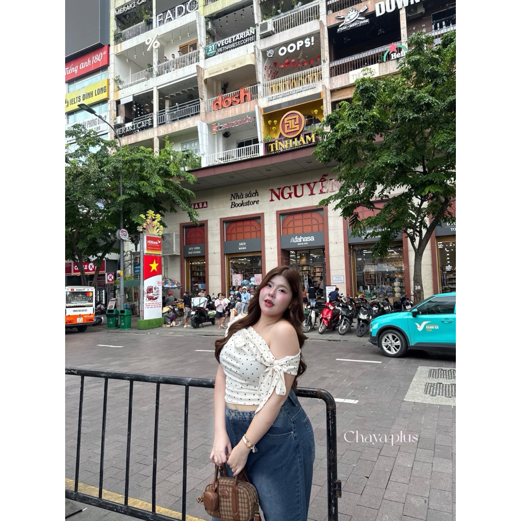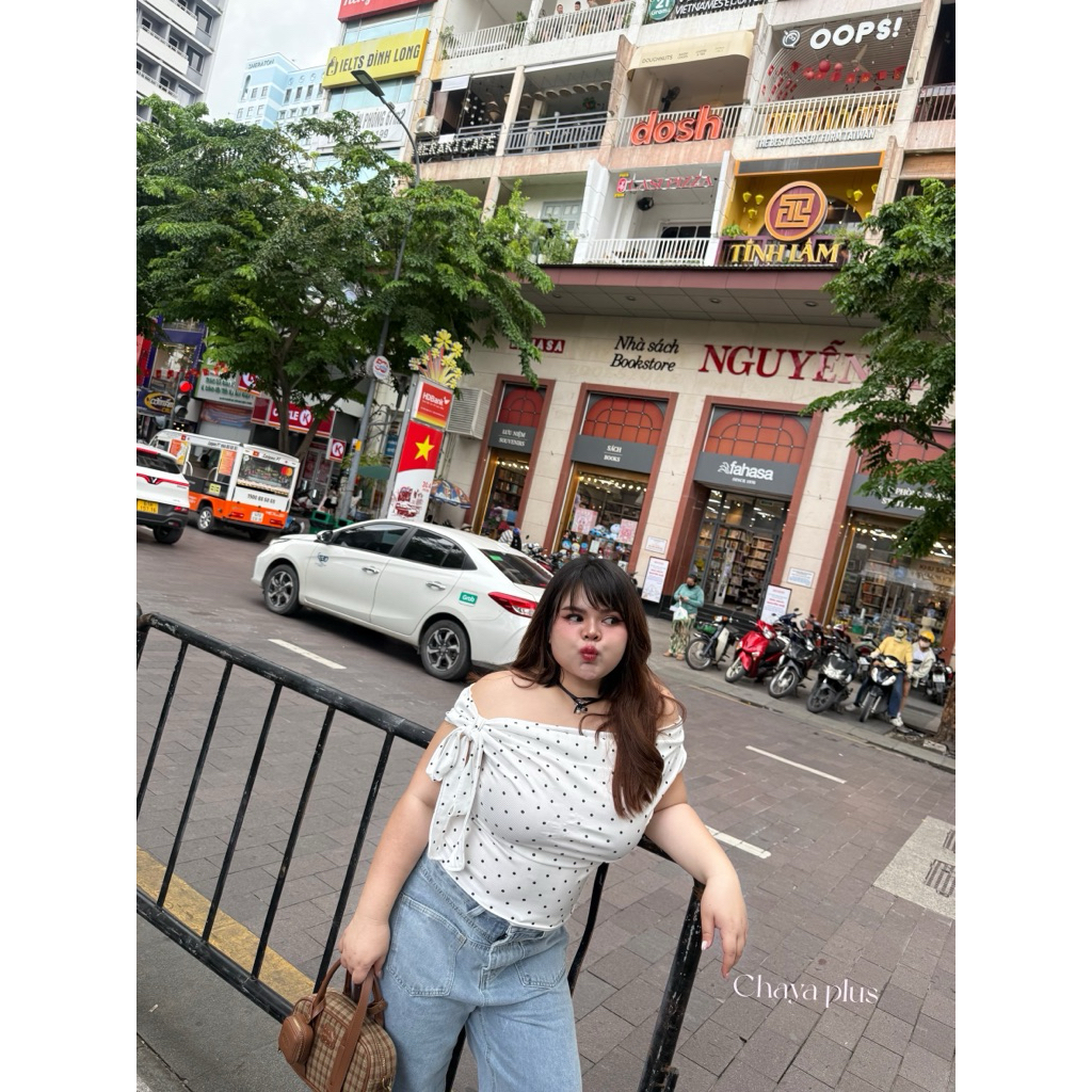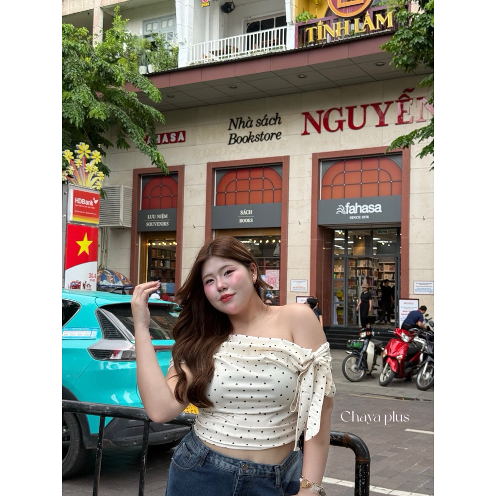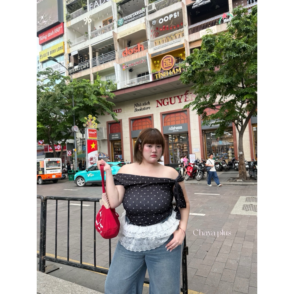 (LD) เสื้อปาดไหล่ มีโบว์ผูกแขน ผ้าร่องลายจุด Polkadot สุดน่ารัก พรางหุ่น เปิดไหล่สวยๆ เสื้อผ้าสาวอวบอ้วน ไซส์ใหญ่