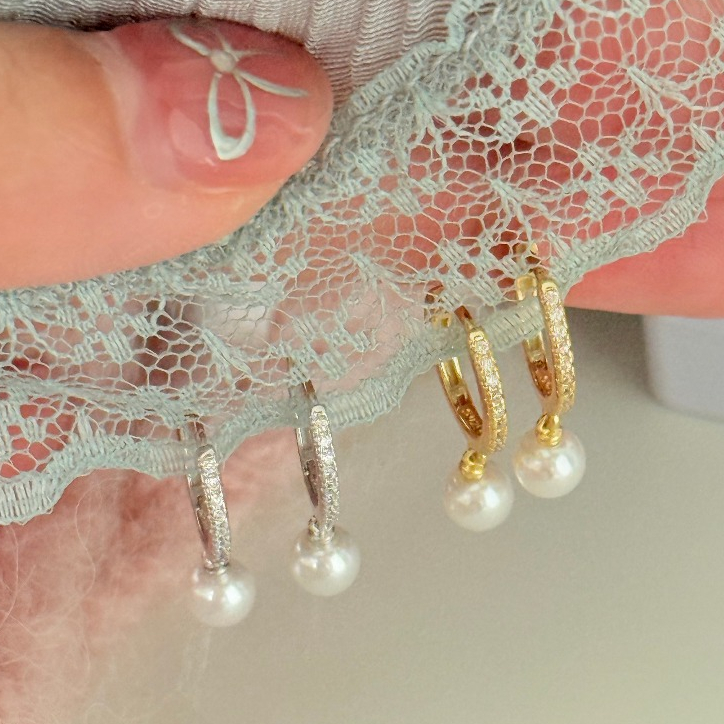 Suwann.na [ราคาต่อคู่] ต่างหูห่วง ต่างหูเงินแท้ ห่วงเพชรตุ้งติ้งมุกห้อย เงิน, ทอง