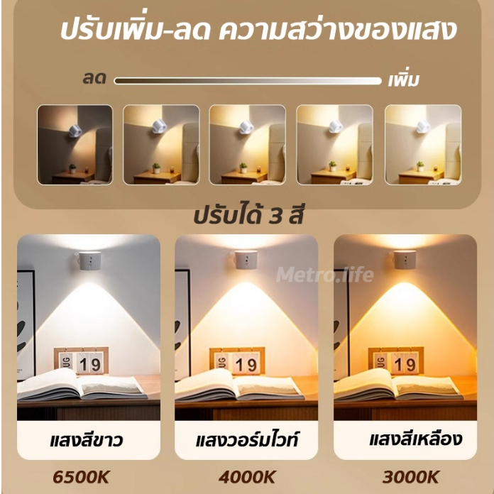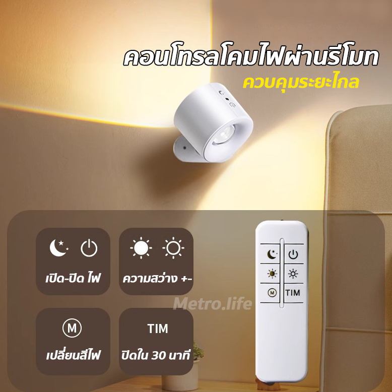 โคมไฟLEDหัวเตียง ปรับ3สี หมุนได้360 เซ็นเซอร์ไฟติดผนัง ชาร์จUSBควบคุมด้วยรีโมท โคมไฟทำงานติดหัวเตียง