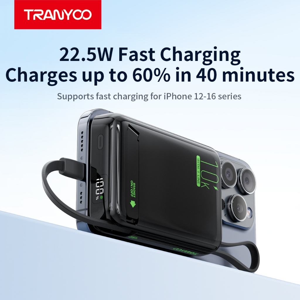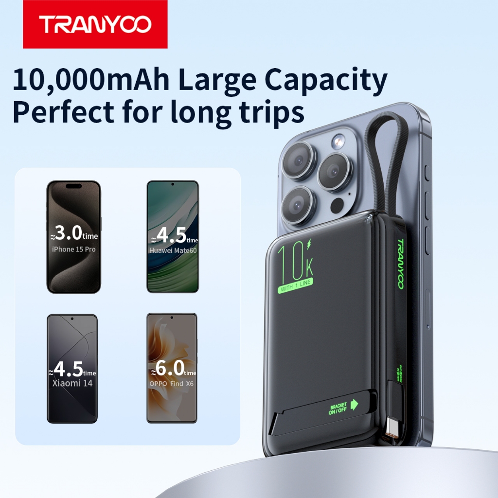 TRANYOO F26 TIS Magnetic Power Bank,10000mAh,Wireless Charging Type-C Charging Cable,Battery Level Display,Built-in Stan
