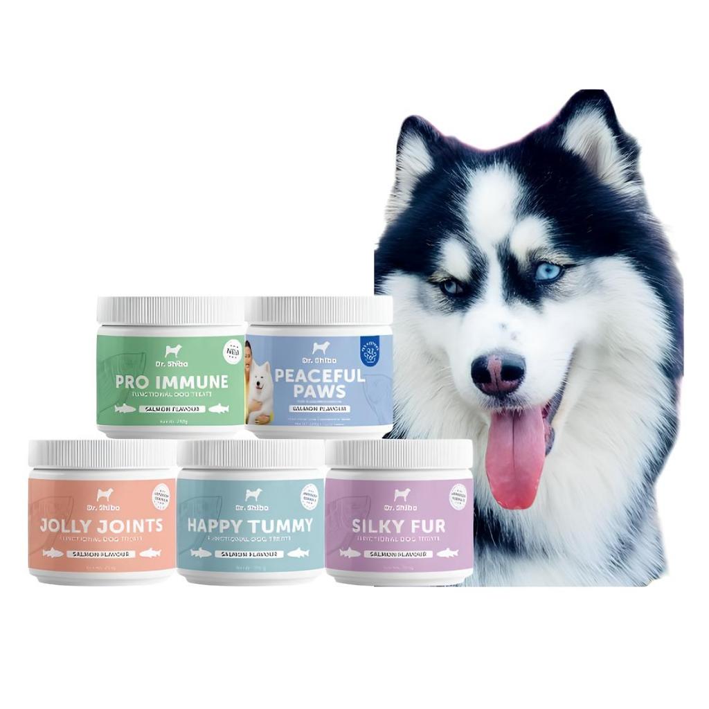 Dr. Shiba (5 สูตร 5 กระป๋อง) Happy Tummy, Jolly Joints, Silky Fur, Pro Immune, Peaceful Paws