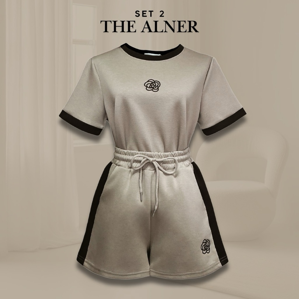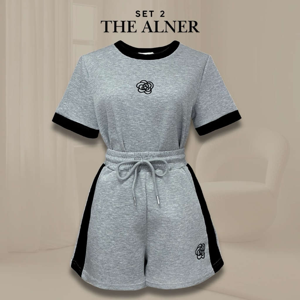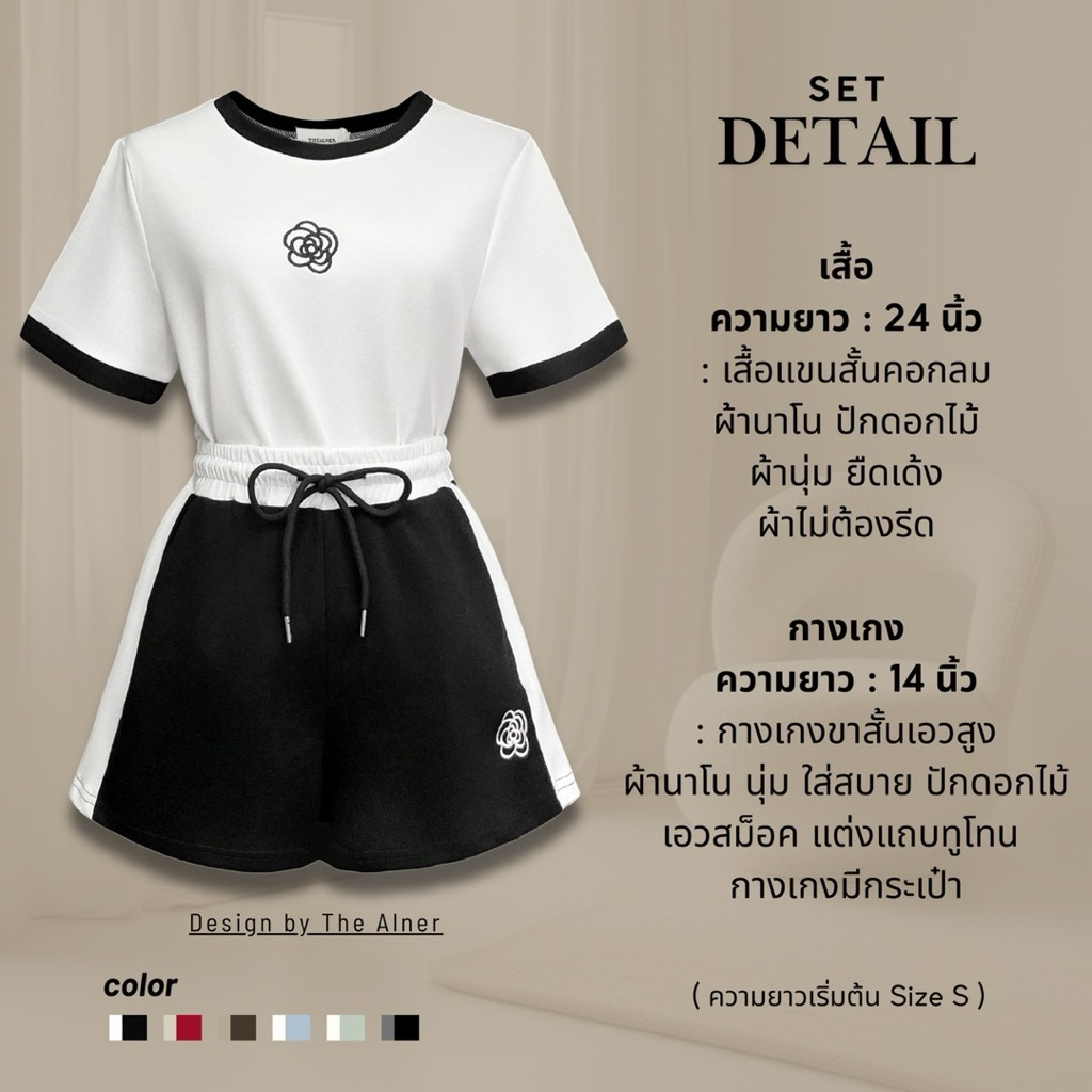 Thealner-AN283 (เซตเสื้อแขนสั้นแต่งแถบปักดอกคามิเลีย กก.วอมขาสั้น)