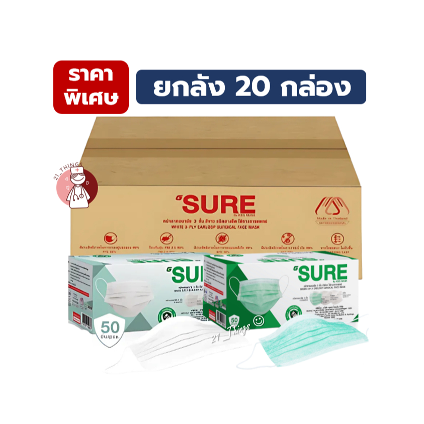 (ยกลัง20กล่อง) หน้ากากอนามัยการแพทย์ 3 ชั้น 50ชิ้น G Sure Mask สี (เขียว/ขาว) หน้ากาก 3 ชั้น ผลิตไทย