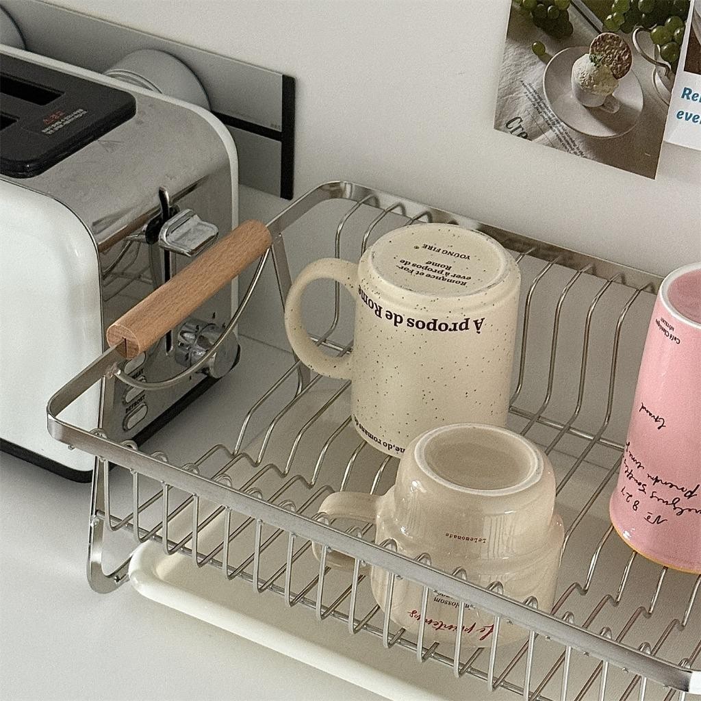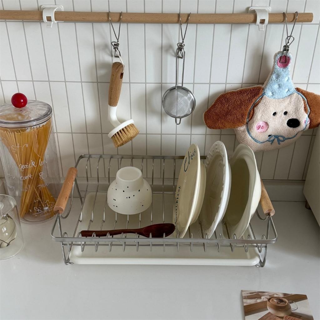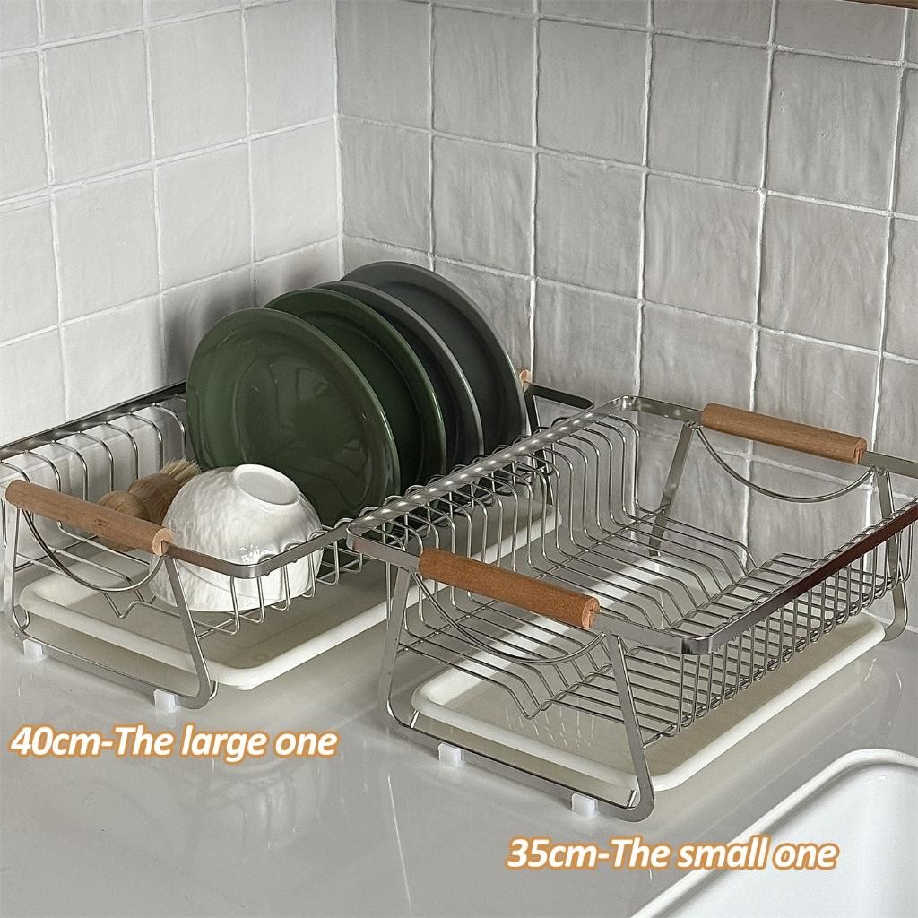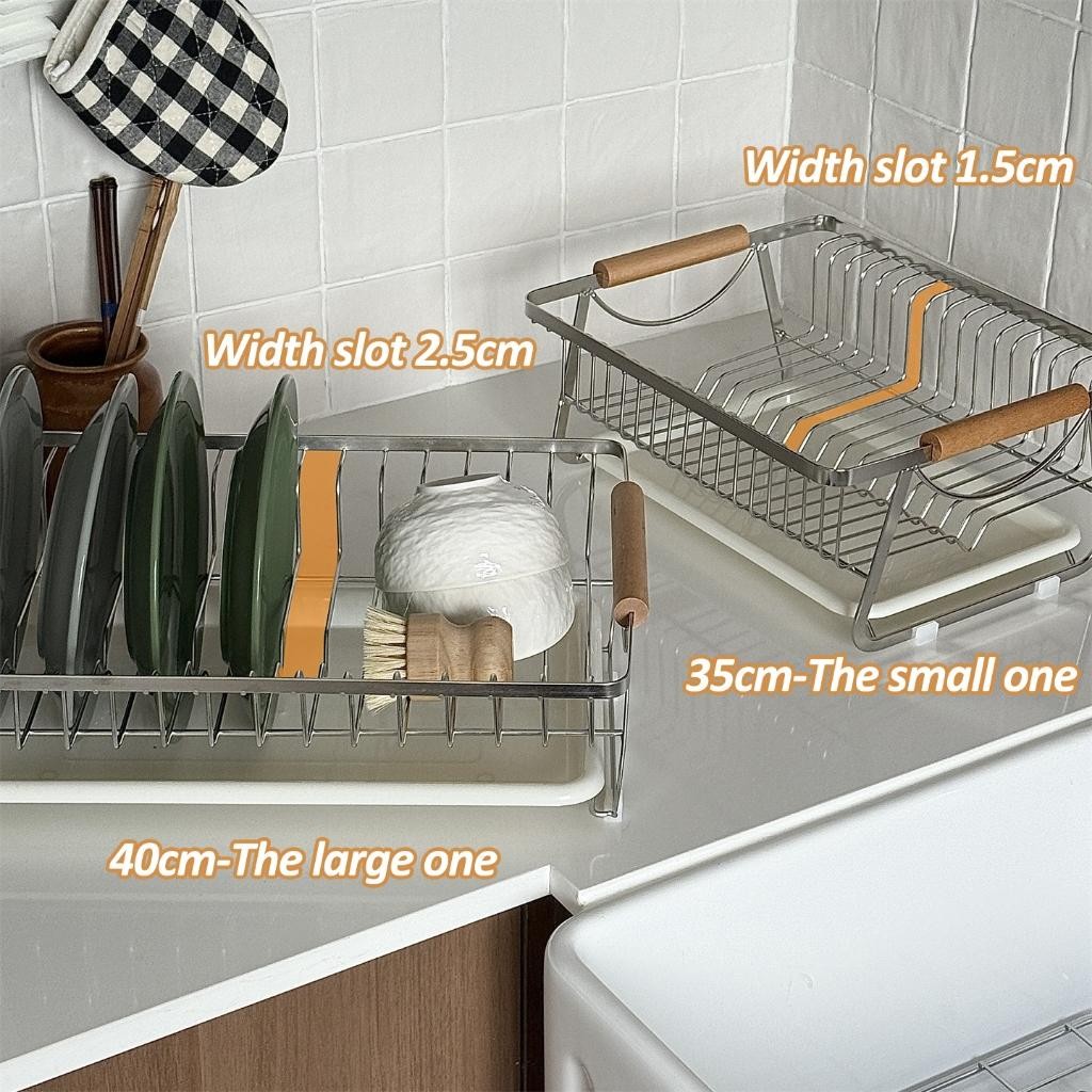 NBSail ชั้นวางจานสแตนเลสพร้อมที่จับไม้และถาดน้ําแบบถอดได้ชั้นวางของในครัว