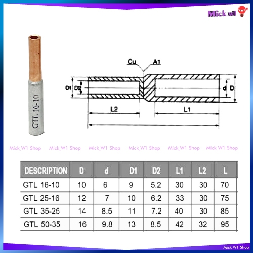 สลิป อลูมิเนียมหัวทองแดง สลิปต่อสาย รุ่น GTL ขนาด 16-10, 25-16, 35-25, 50-35