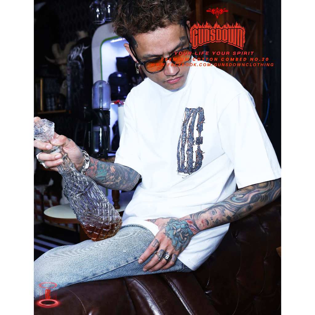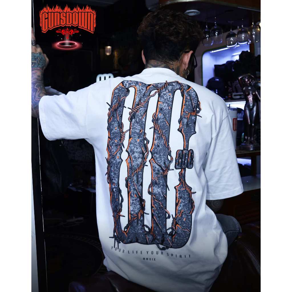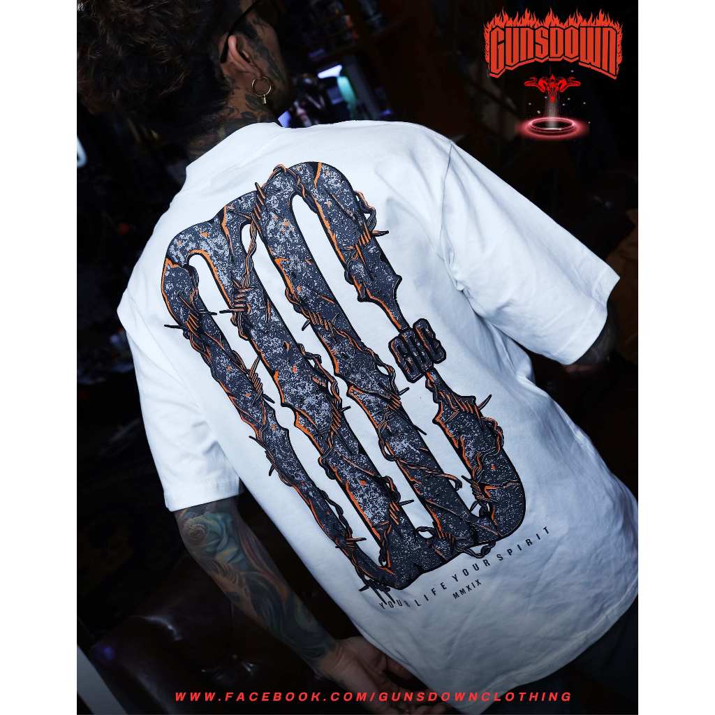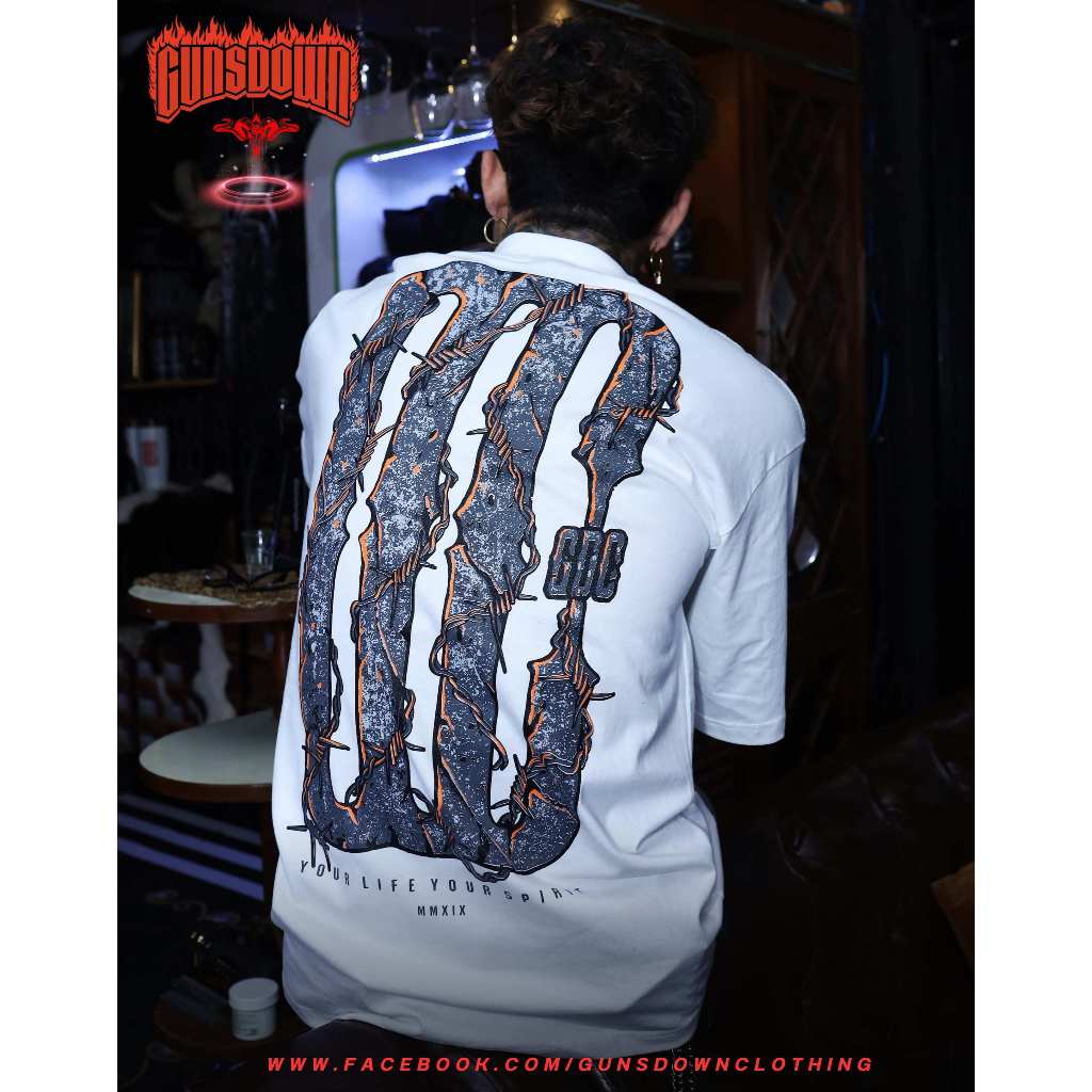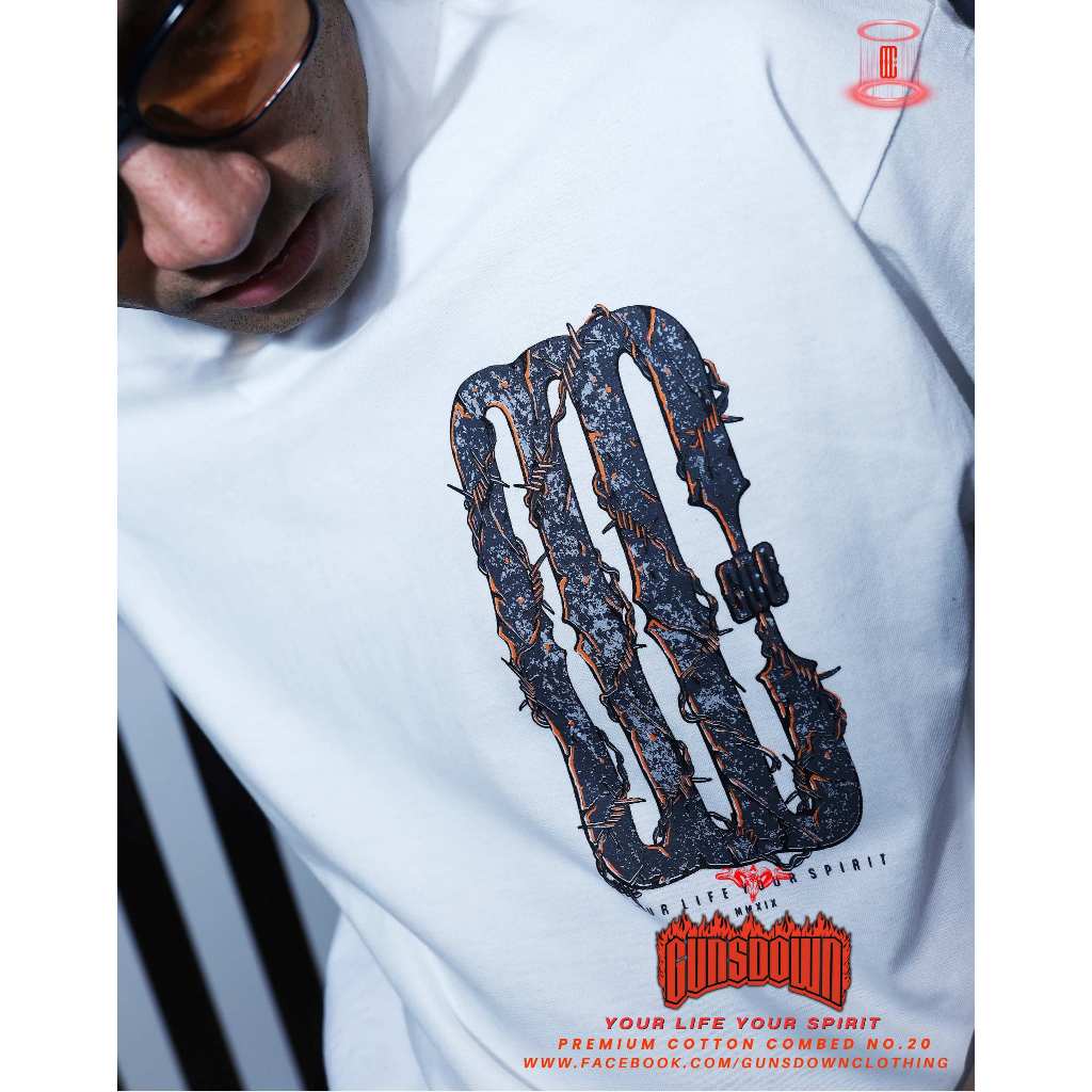 เสื้อยืดคอฟิตสีขาว 𝐆𝐔𝐍𝐒𝐃𝐎𝐖𝐍® : Barbed wire GDC-BW02