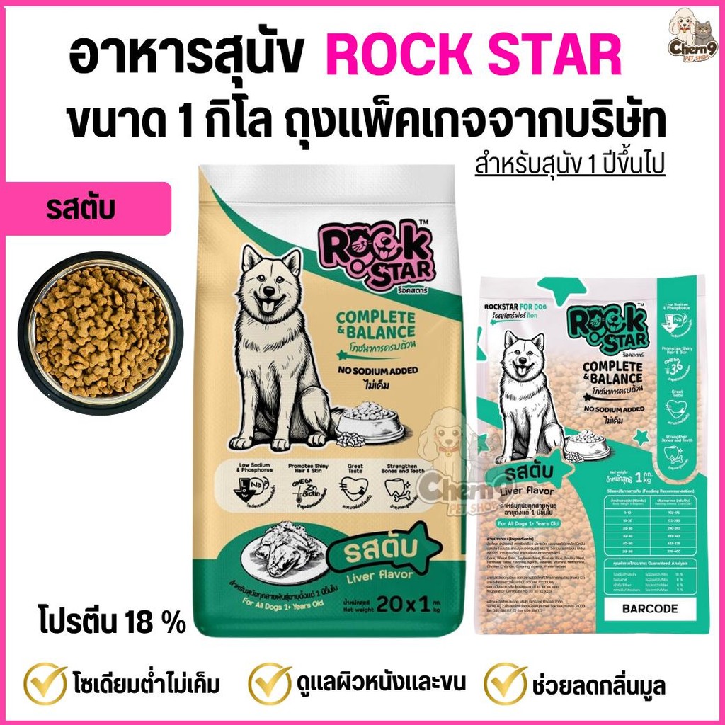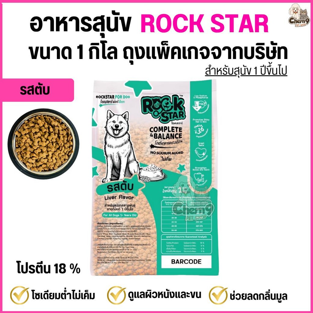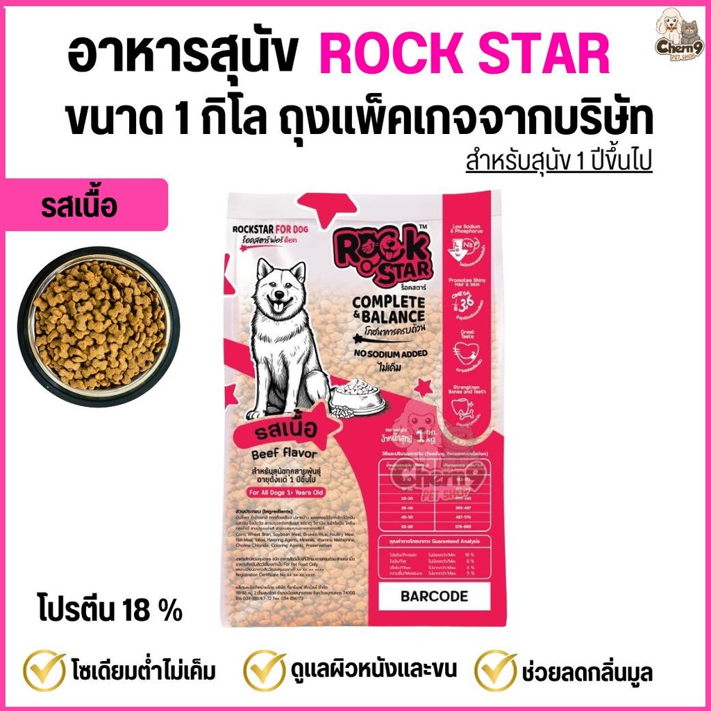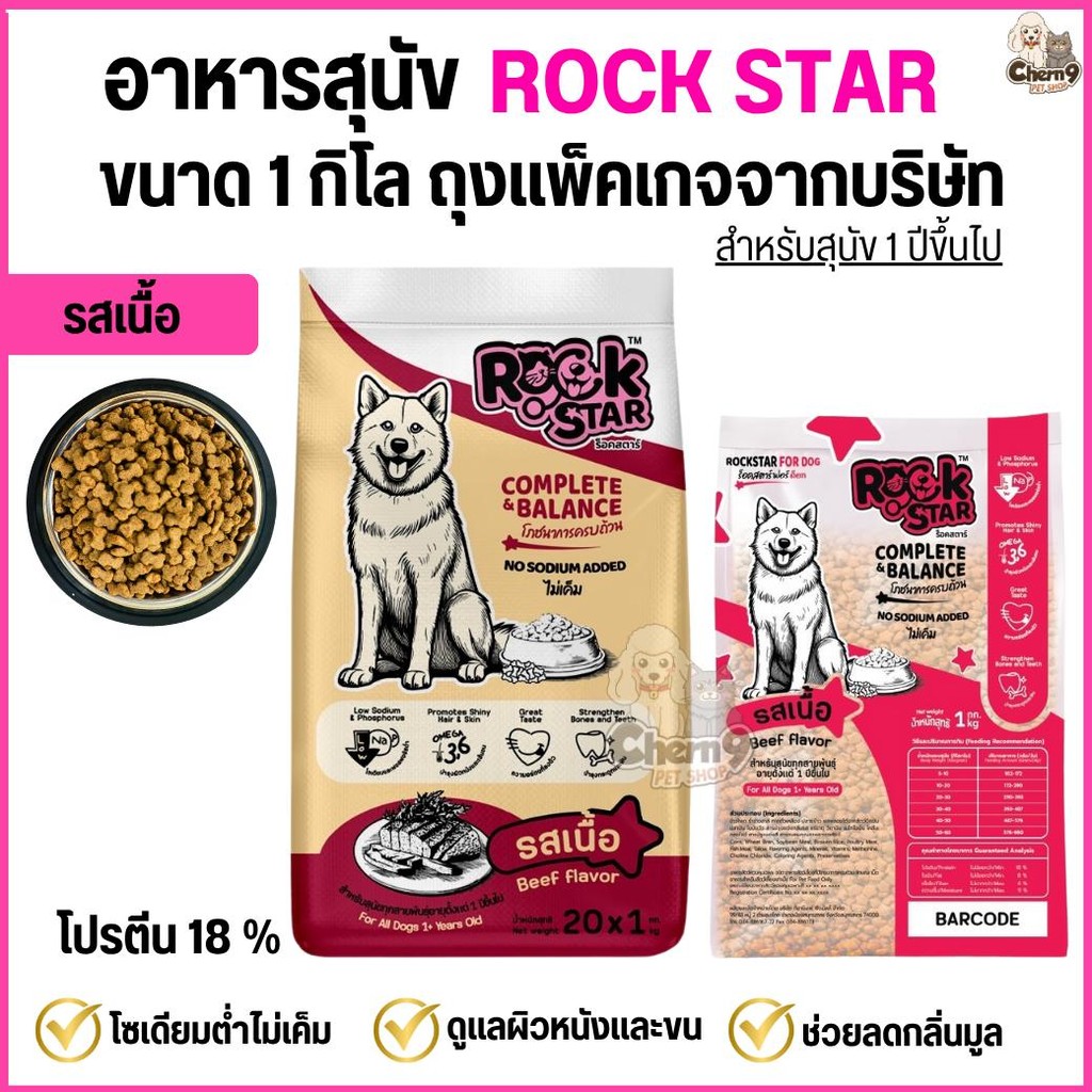 (จำนวน3ถุง=3กิโล) อาหารสุนัข ROCKSTAR >> สูตรไม่เค็ม ลดกลิ่นมูล ขนนุ่มสวย โปรตีน18% <<** ถุงขนาด1กิลโลจากโรงงาน