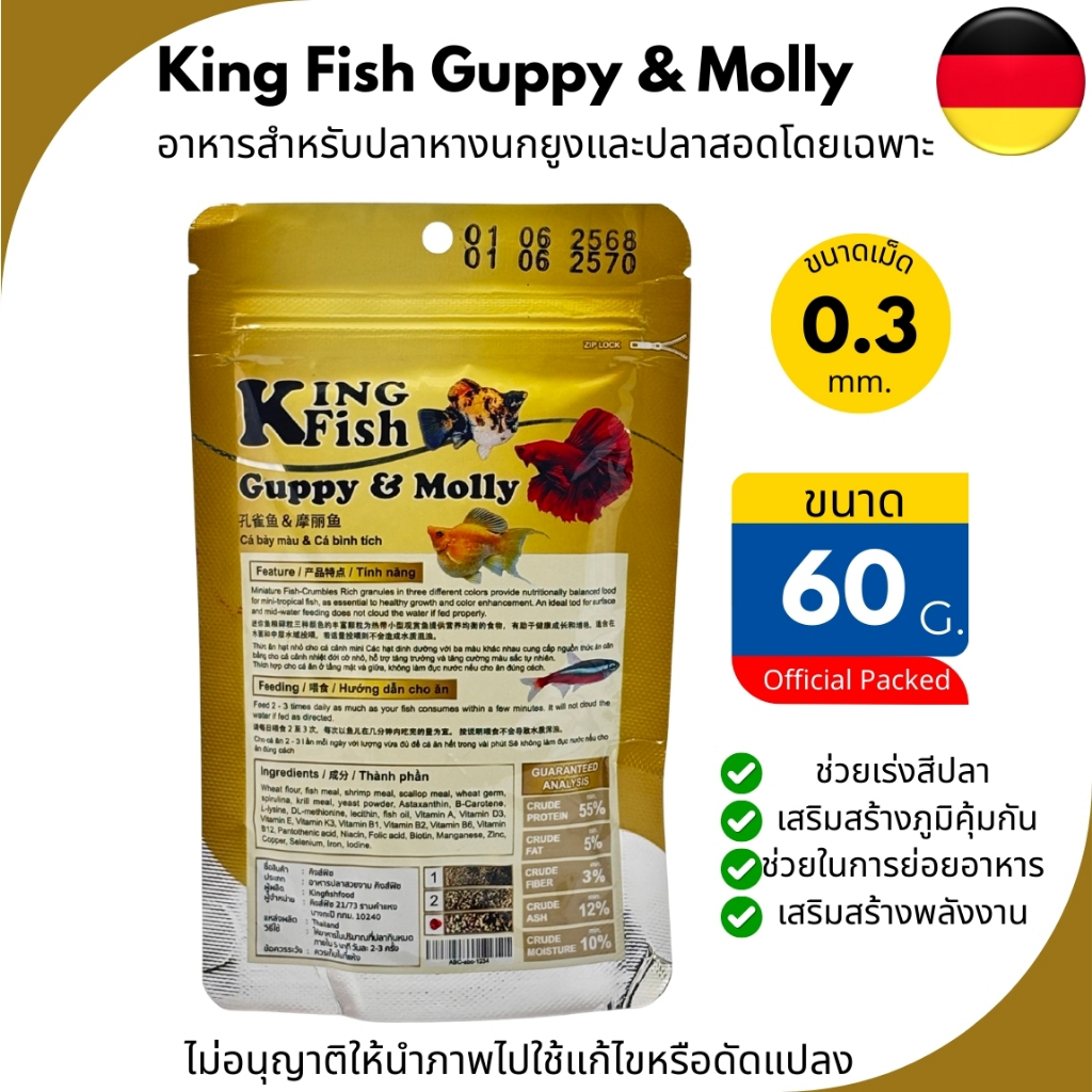 King Fish Guppy & Molly อาหารปลา สำหรับปลาหางนกยูงและปลาสอด(ขนาดเม็ด0.3mm.) ขนาด60กรัม