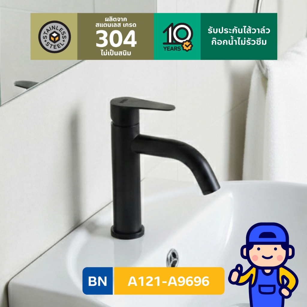 BEN A121-A9696 ก๊อกน้ำเย็นเดี่ยว ติดตั้งกับอ่างได้ทุกยี่ห้อ วัสดุสแตนเลส 304 สีดำ รับประกันวาล์วก๊อกน้ำไม่รั่วซึม 10 ปี