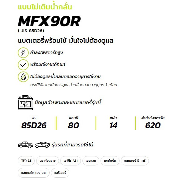 ส่งด่วน GS MFX-90L/R (80Ah) 85D26 Battery แบตรถยนต์ กึ่งแห้ง แท้ ใหม่ ไม่ต้องเติมน้ำ พร้อมใช้ MFX90L