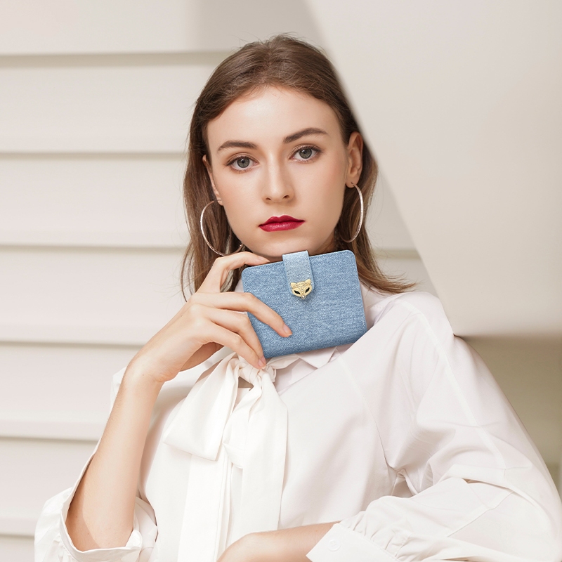FOXLOVER กระเป๋าสตางค์ผู้หญิงใบสั้น ช่องใส่การ์ด 14ช่อง ต่อต้าน RFID ผ้ายีนส์แฟชั่น ฟรีกล่องของขวัญ