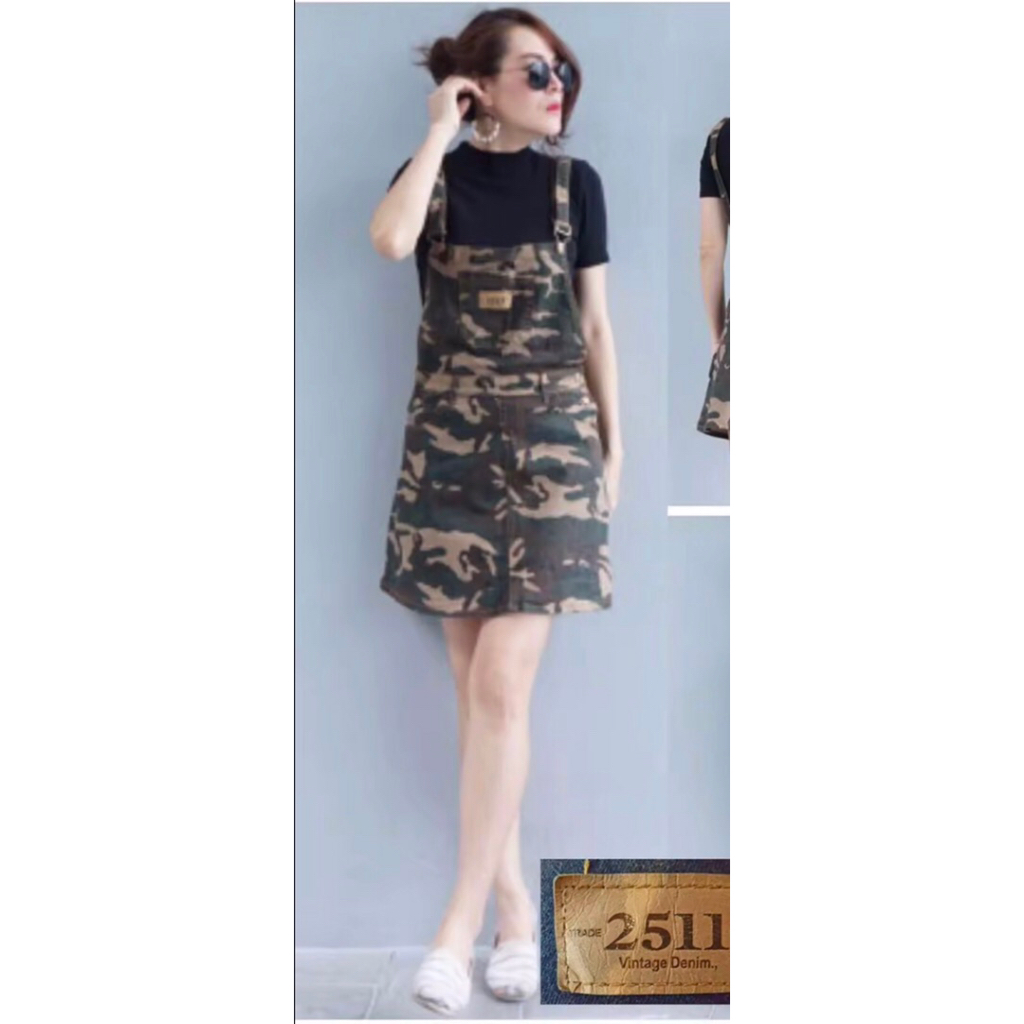 เอี๊ยมกระโปรงยีนส์ลายทหารพรางผ้ายืดเล็กน้อยมีS,M,L
