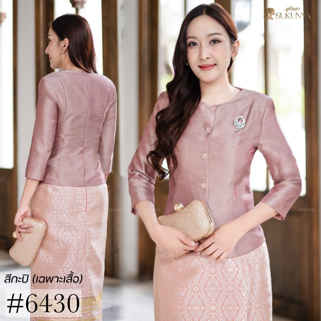 Sukunya 6430 : งานเสื้อผ้าไหมตะวันเส้นขีด คอกลม แต่งกระดุมหลอก แขนทรงกระบอก