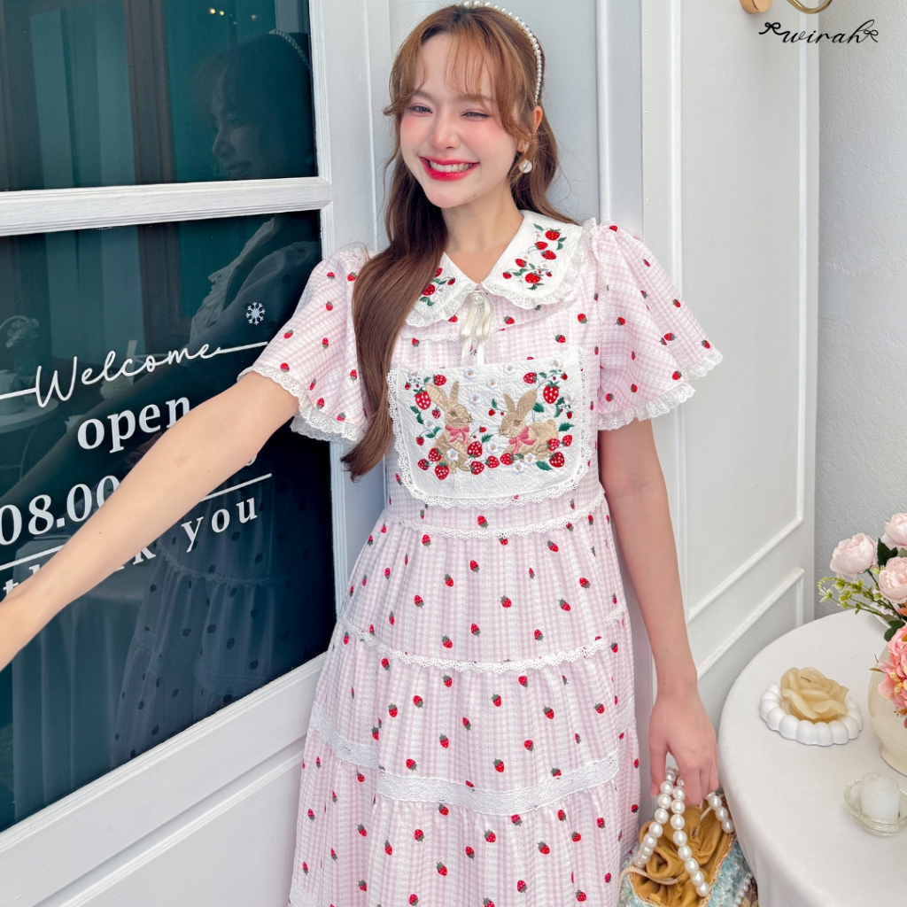 「 Wirah_Brand 」DW181 Rabbit x Strawberry Dress : ชุดเดรสยาวผ้า cotton ทอลายตารางสลับทอลายลูกไม้