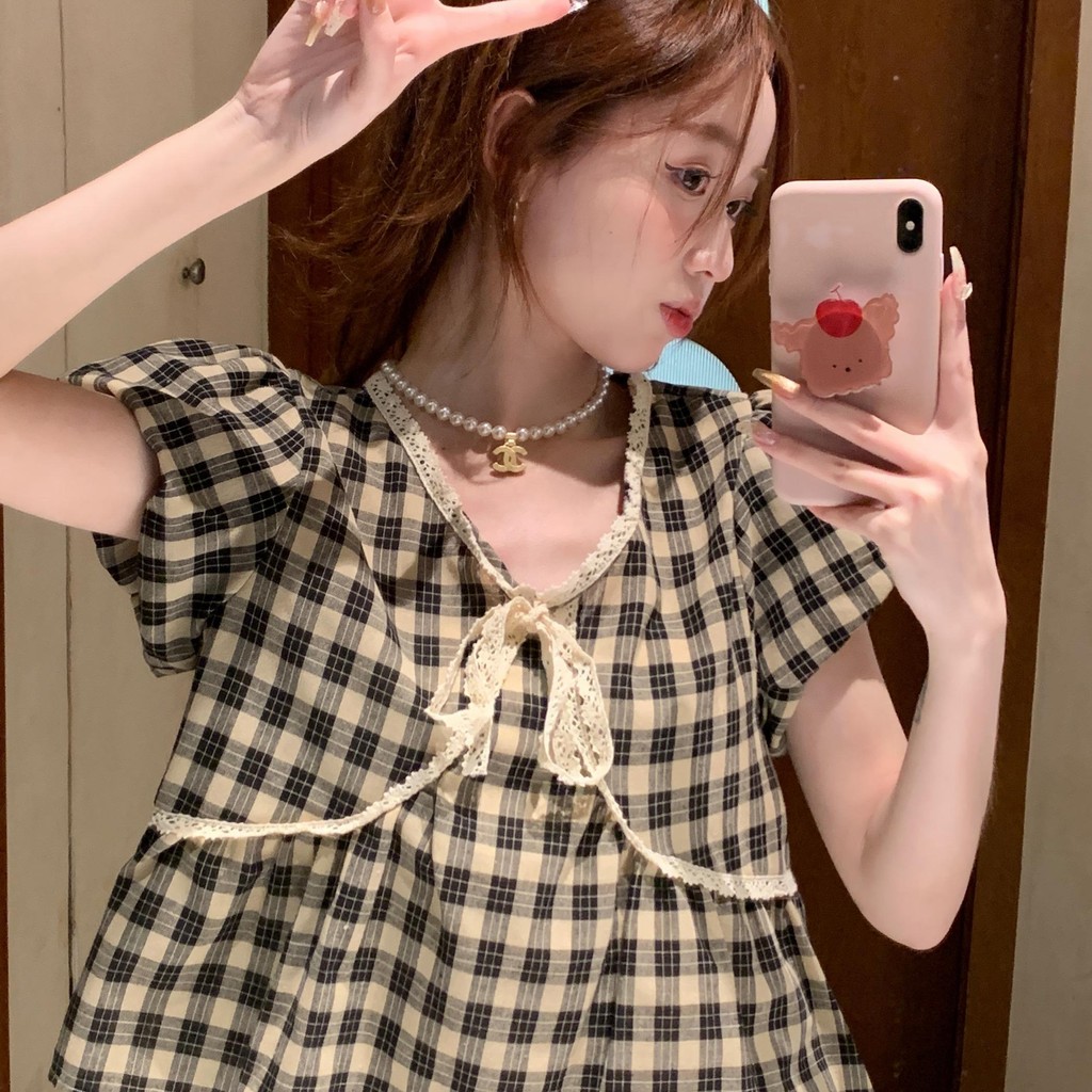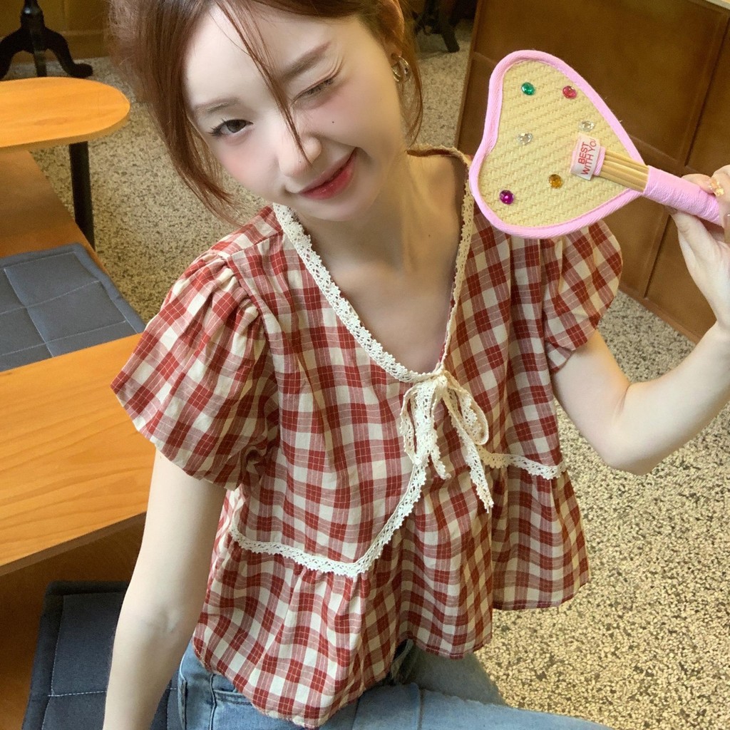 Chili#เสื้อเชิ้ตลายสก็อตผู้หญิงฤดูร้อนใหม่สไตล์เกาหลีย้อนยุคลูกไม้ฟองลูกไม้หวานออกแบบตุ๊กตาด้านบน#W632