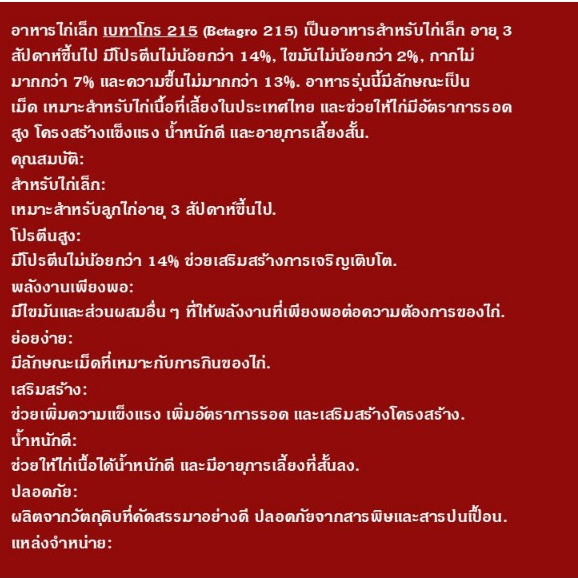 อาหารไ่ก่เล็ก Betagro 215L ขนาด 30 กก. โปรตีน 14%