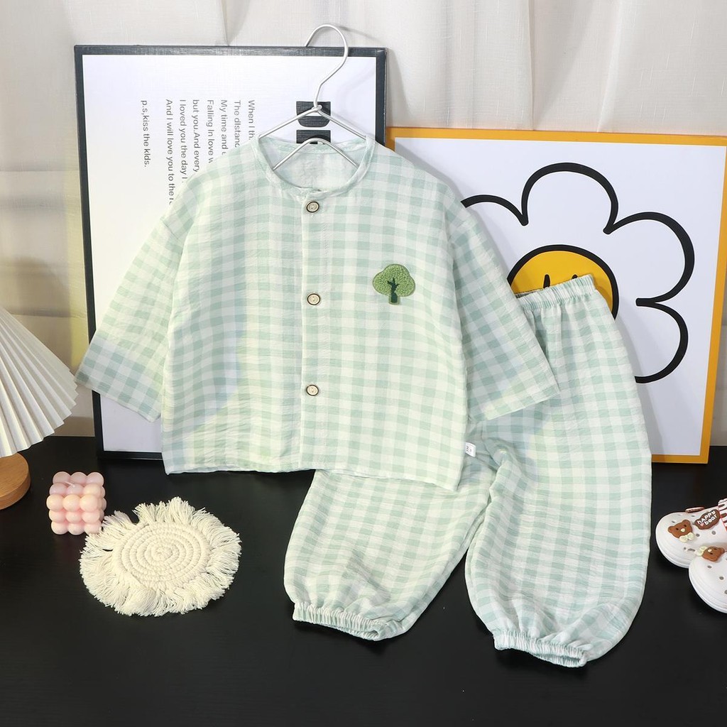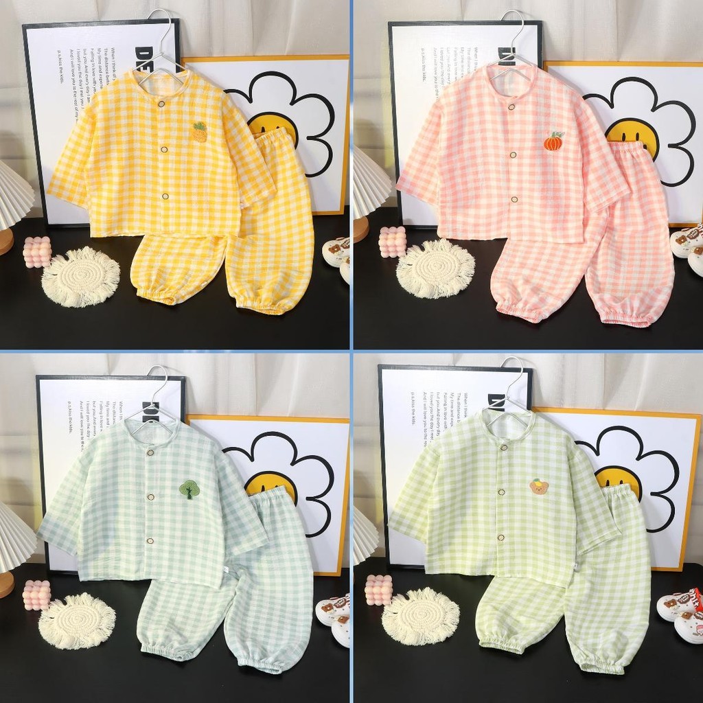 นางแบบขายดีของเกาหลี ชุดนอนน่ารักๆ ชุดนอนเด็ก แฟชันสำหรับเด็กหญิง/ชาย ลายสก็อต ขายาว เบาใส่สบาย ไซส์80-130cm “DA-S”