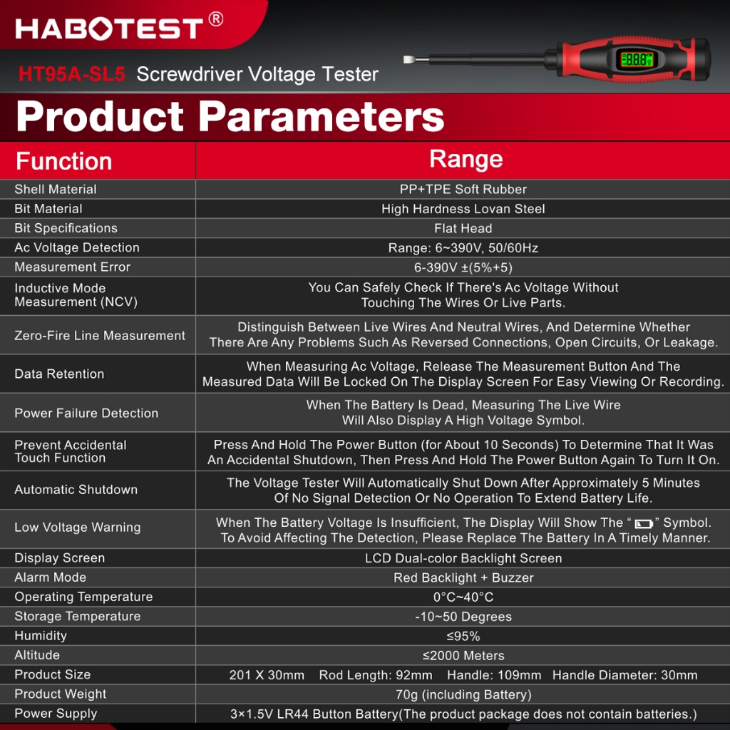 HABOTEST HT95A-SL5 เครื่องวัดแรงดันไฟฟ้าไขควงพร้อมฟังก์ชั่น 2-in-1 6v-390V แรงดันไฟฟ้า AC NCV ดาวน์โหลดจอ LCD เหมาะสําหรับการทดสอบไฟฟ้าในบ้านและอุตสาหกรรม