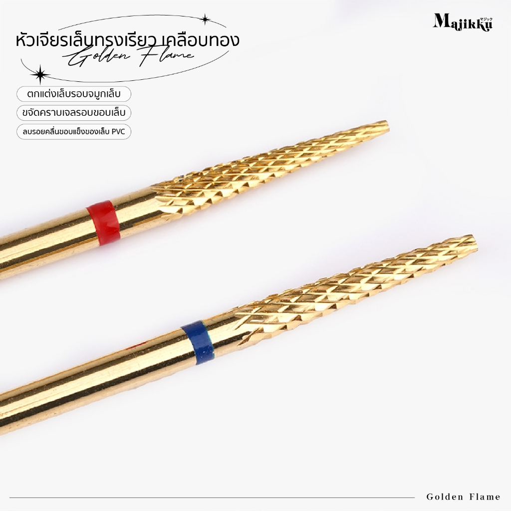 Majikku หัวเจียร คาร์ไบด์คุณภาพ Golden Flame เจียรง่าย เข้าซอกลึก ไม่ทำร้ายผิว หัวเจียรเล็บทรงเรียว เคลือบทอง