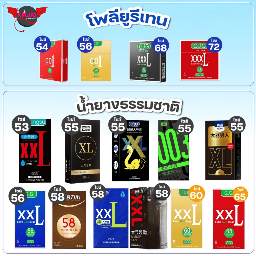 รวมแบรนด์ ถุงยางไซส์ใหญ่ XXL ขนาด 72, 68, 65, 60, 58, 56, 55, 53 มม. ผิวเรียบ บาง 0.01