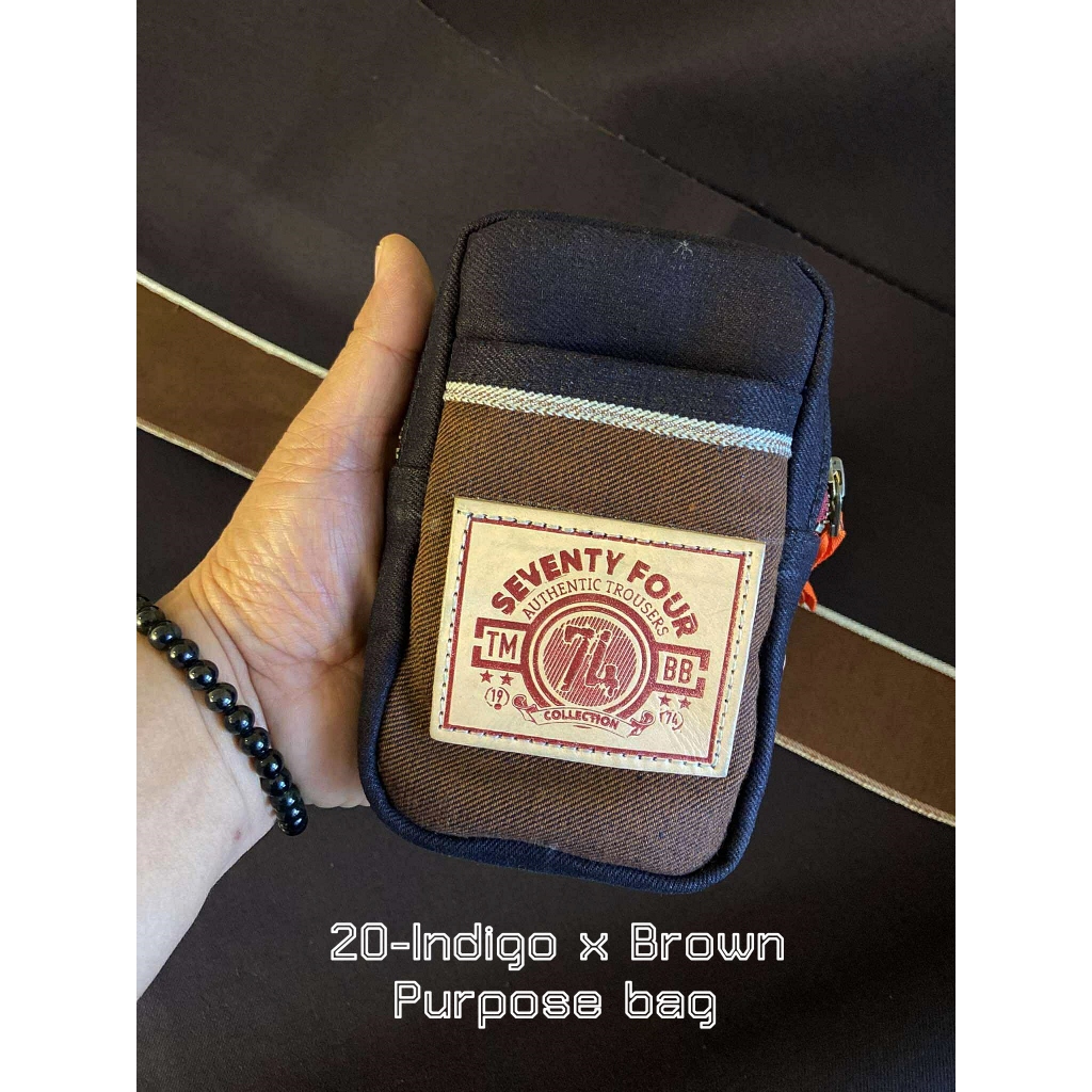 20-Indigo x Brown ./กระเป๋าใส่โทรศัพท์ (ซิป1ช่อง) แบบติดป้ายหนัง / ด้านในกุ้นสีส้ม.